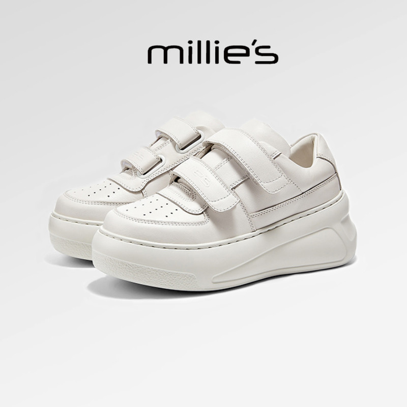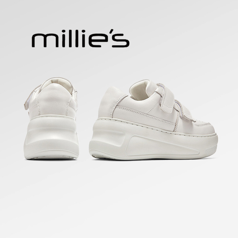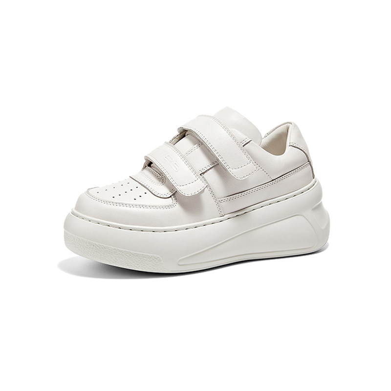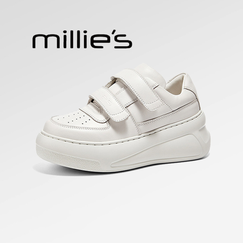 妙丽2026春季女鞋厚底增高 真皮板鞋 魔术贴休闲面包鞋小白鞋女