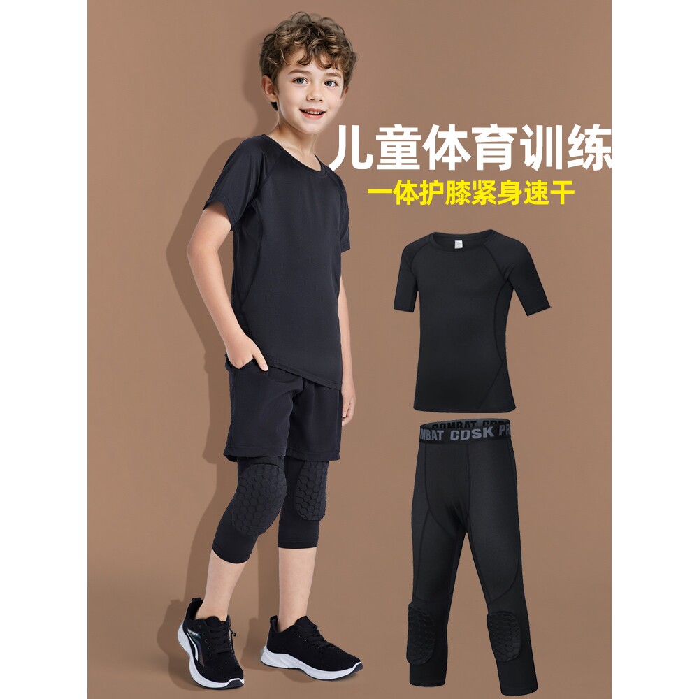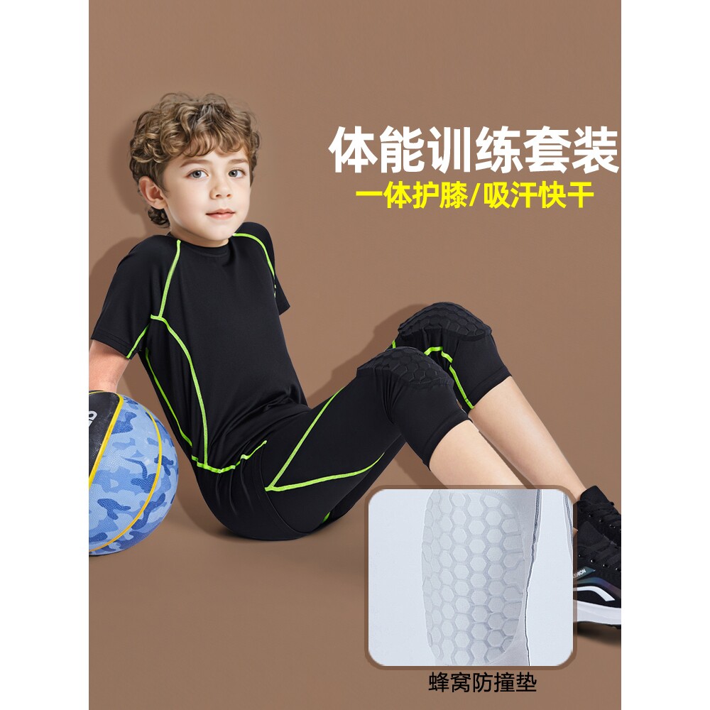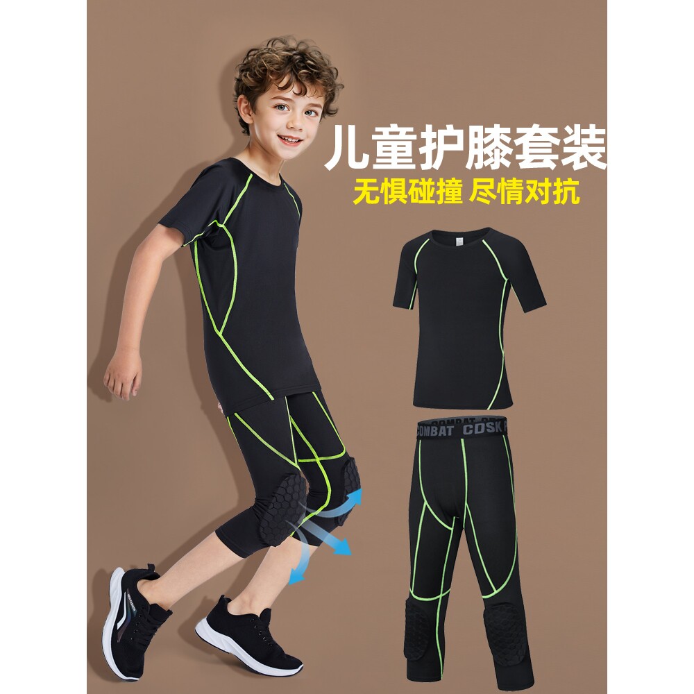 儿童篮球服打底防撞带护膝一体七分裤夏短袖速干衣训练服运动套装