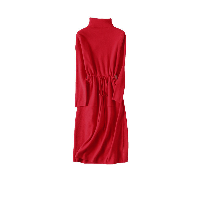 早春季流行红色半高领宽松毛衣裙大码女装气质长袖针织收腰连衣裙