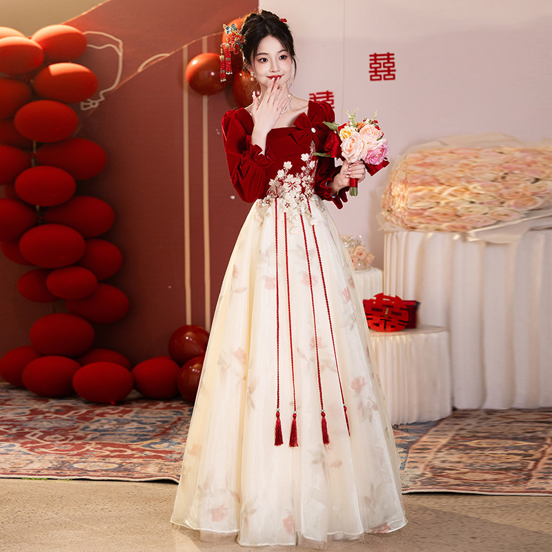 大码敬酒服新娘长袖2025新款胖mm200斤红色结婚订婚礼服连衣裙女