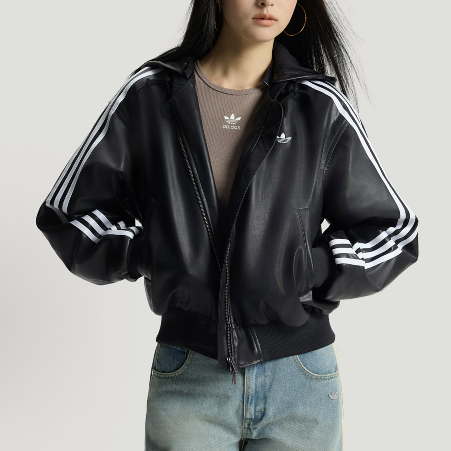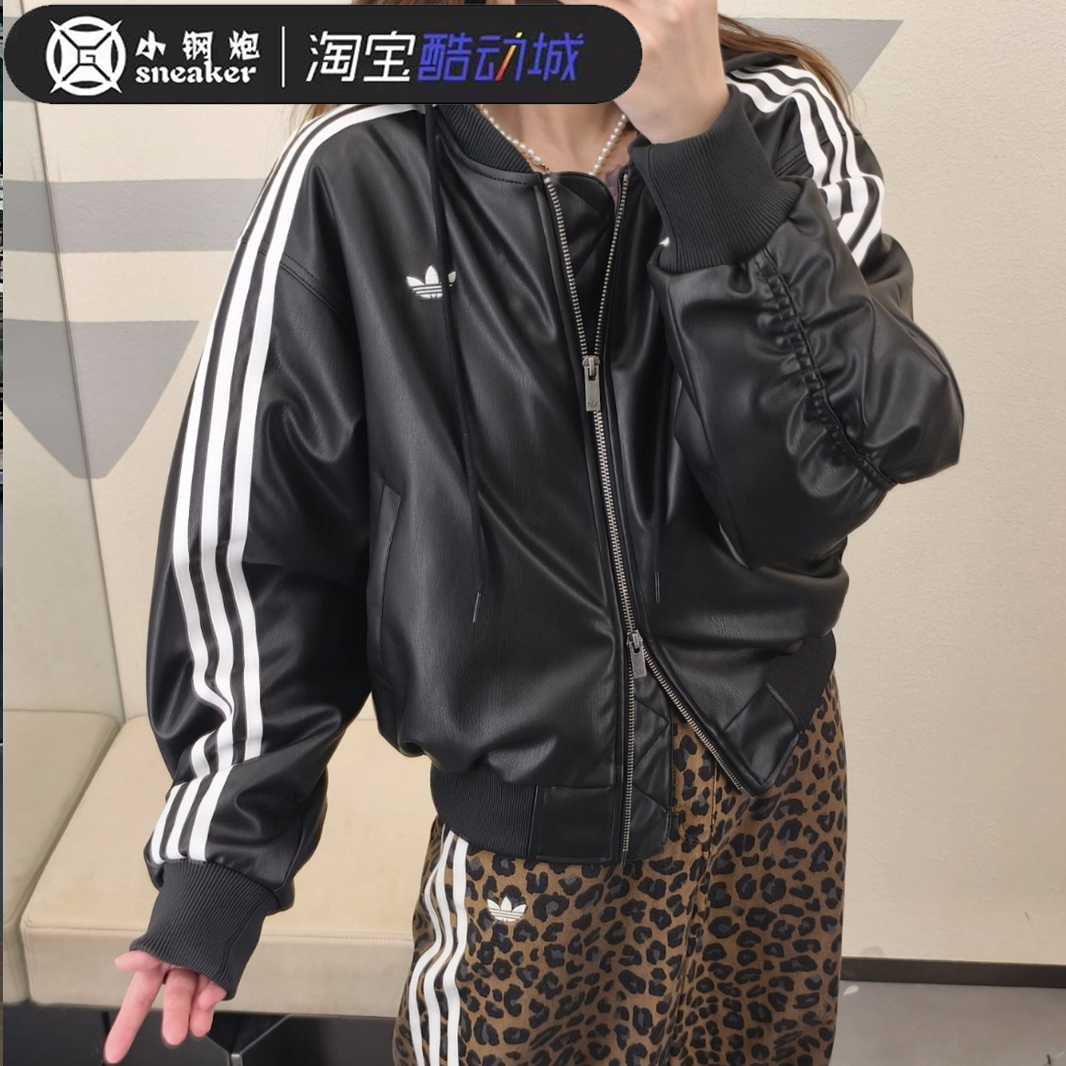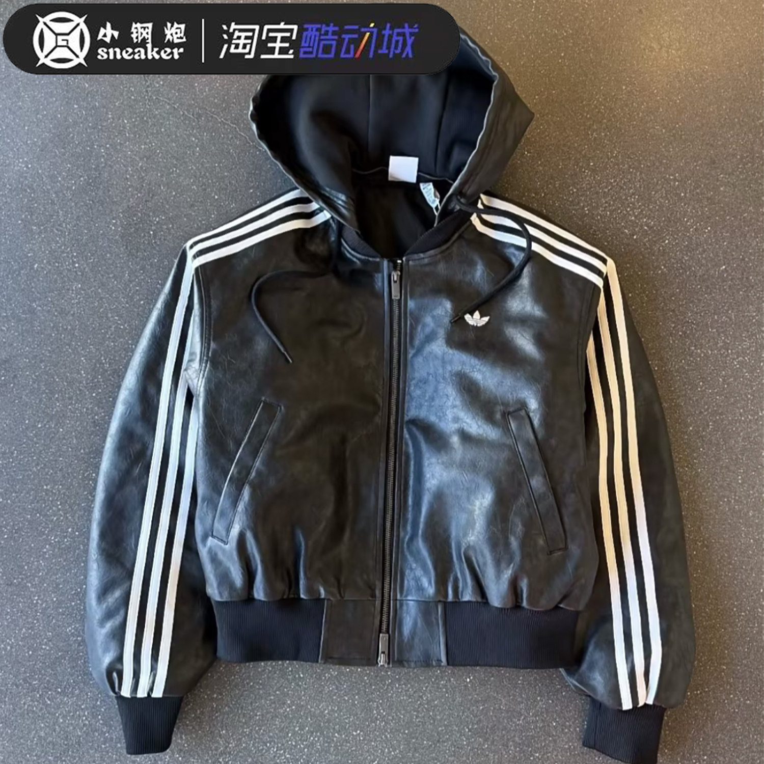 Adidas三叶草26冬款男女款棉衣可拆卸帽黑色仿皮衣夹克外套KU6857
