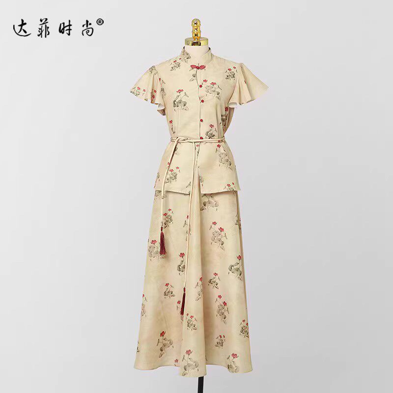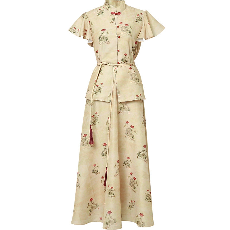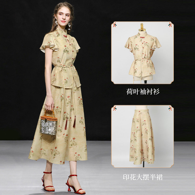 夏季女装2026新款气质两件套国风印花衬衫上衣长裙裙子套装潮清