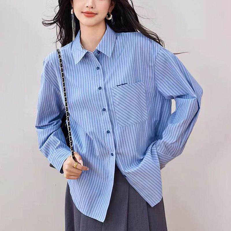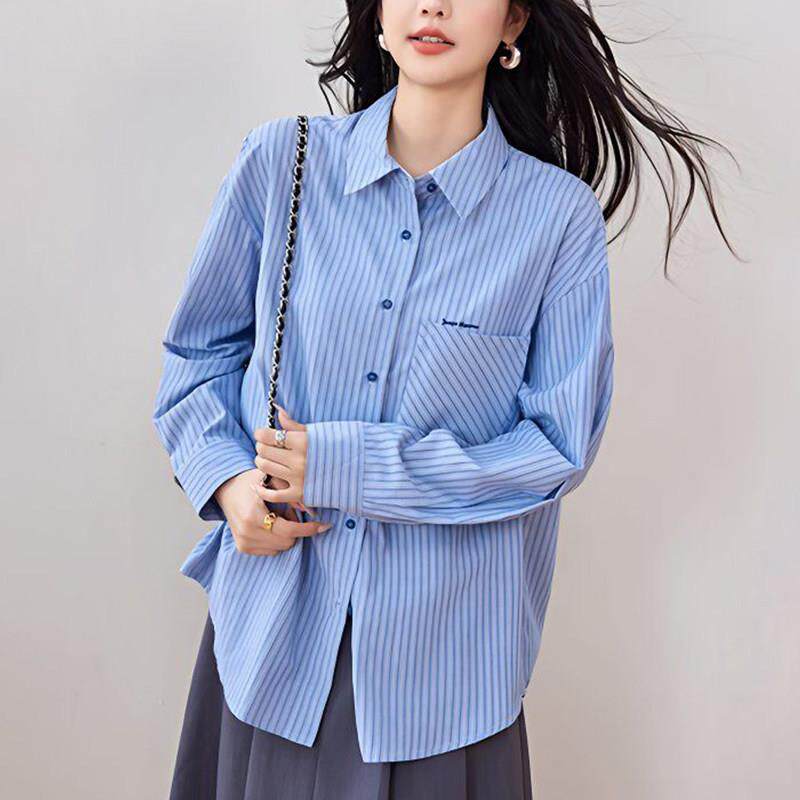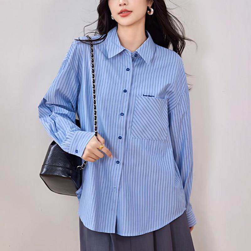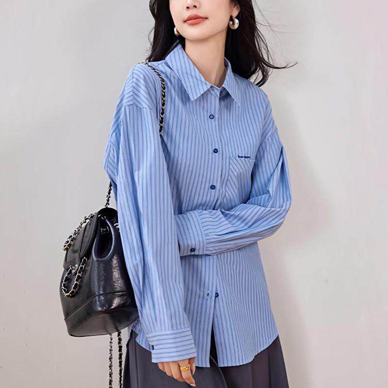 漂亮欧货大码蓝色条纹衬衫女款春装2026轻奢高级感洋气上衣0426d