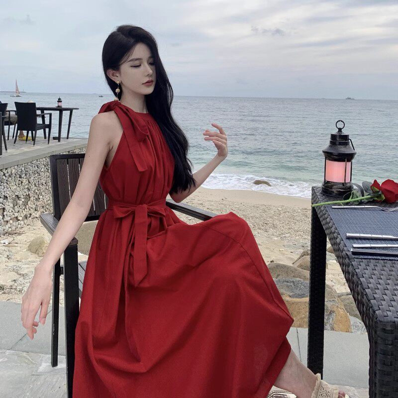 法式红色挂脖吊带连衣裙女夏新娘晨袍礼服新疆旅行海边度假长裙夏