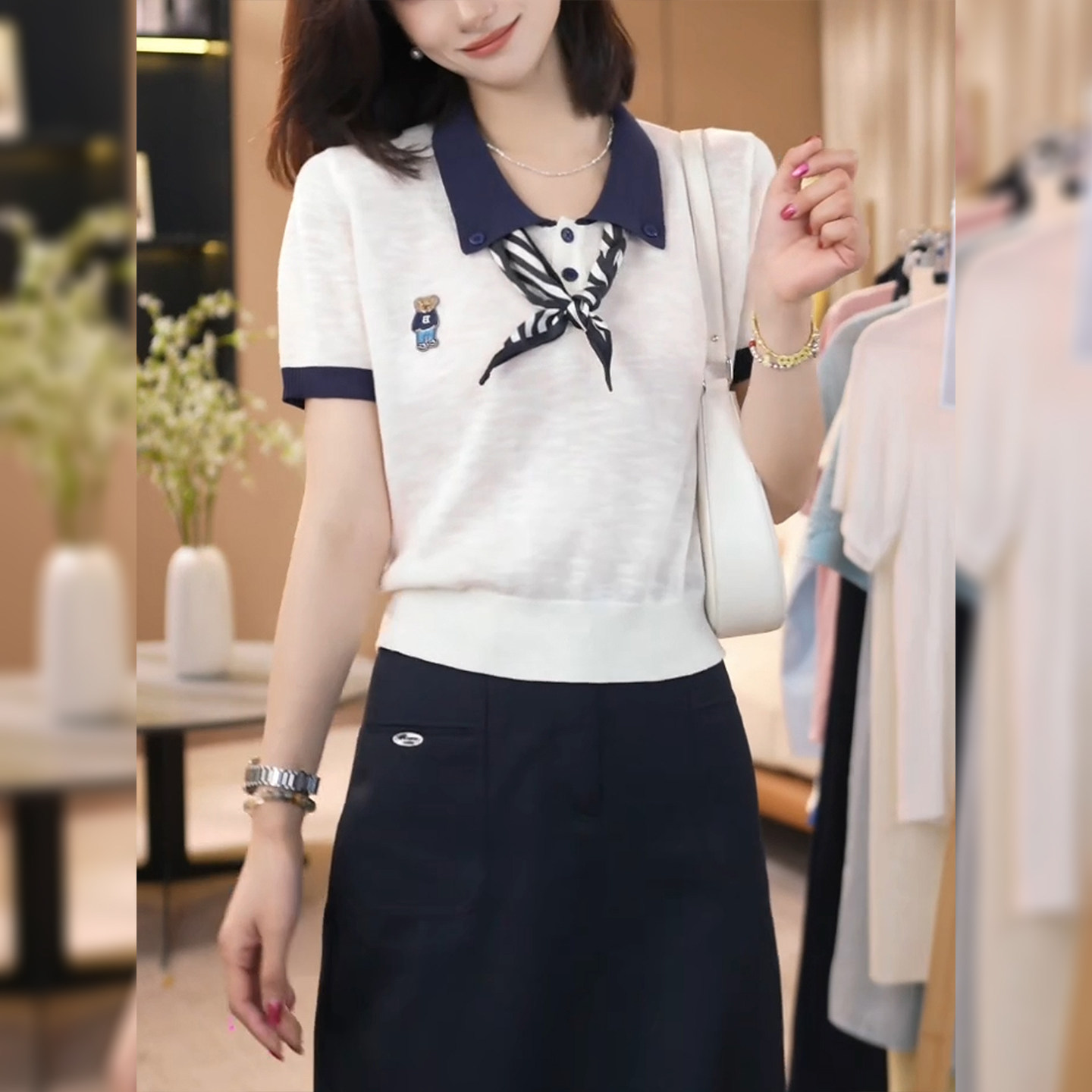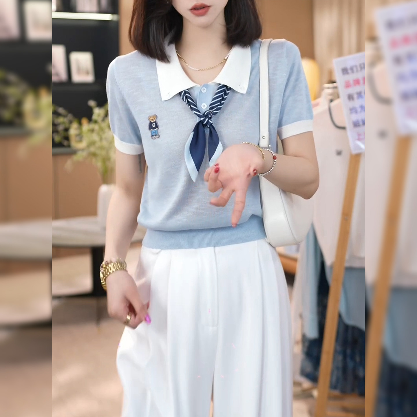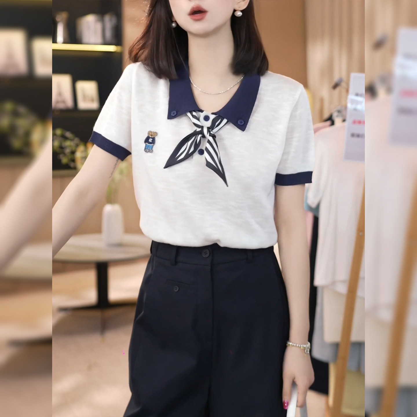 蓝色翻领刺绣针织短袖t恤女2026年夏季新款韩系百搭减龄显瘦上衣