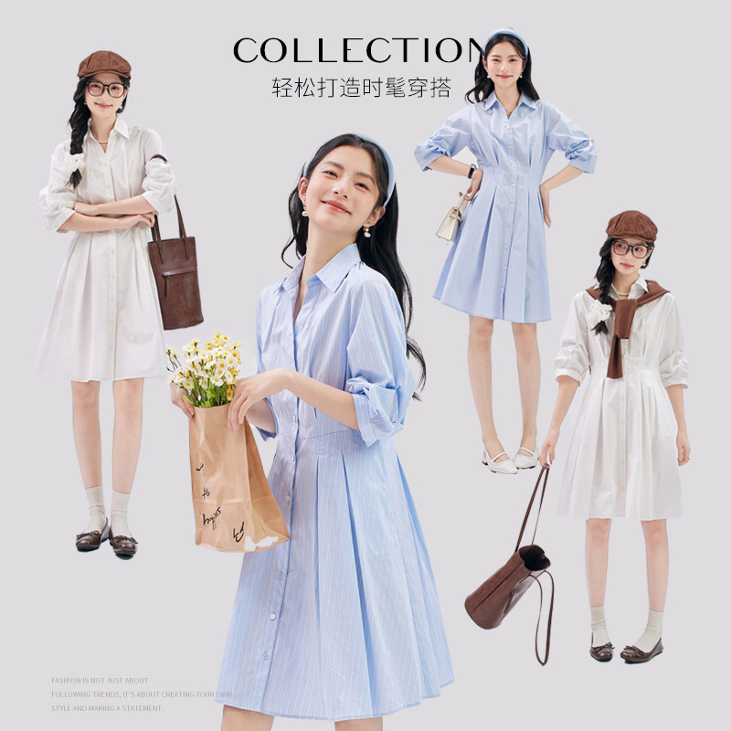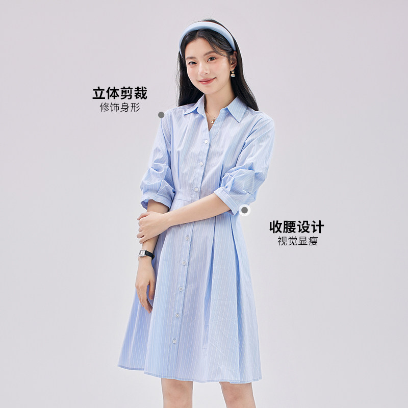 达佳诗蓝色条纹裙子女夏新款小个子短裙轻职场通勤穿搭短袖连衣裙