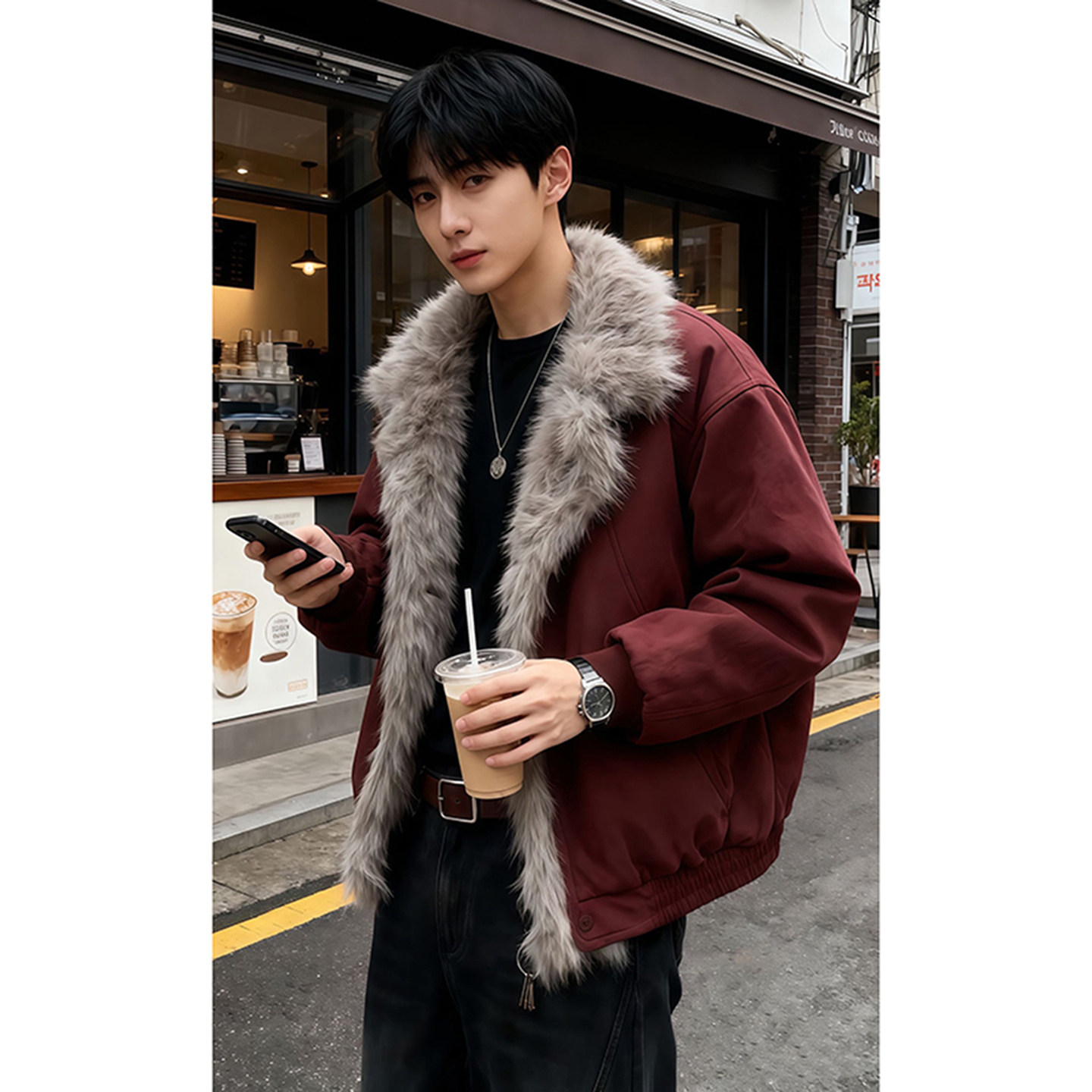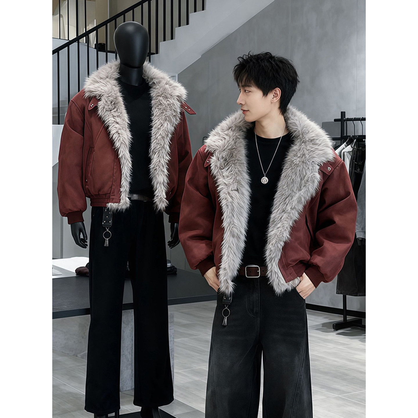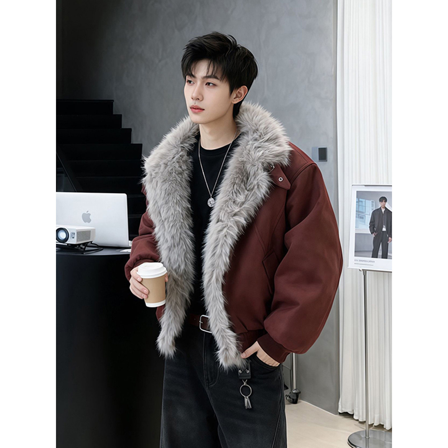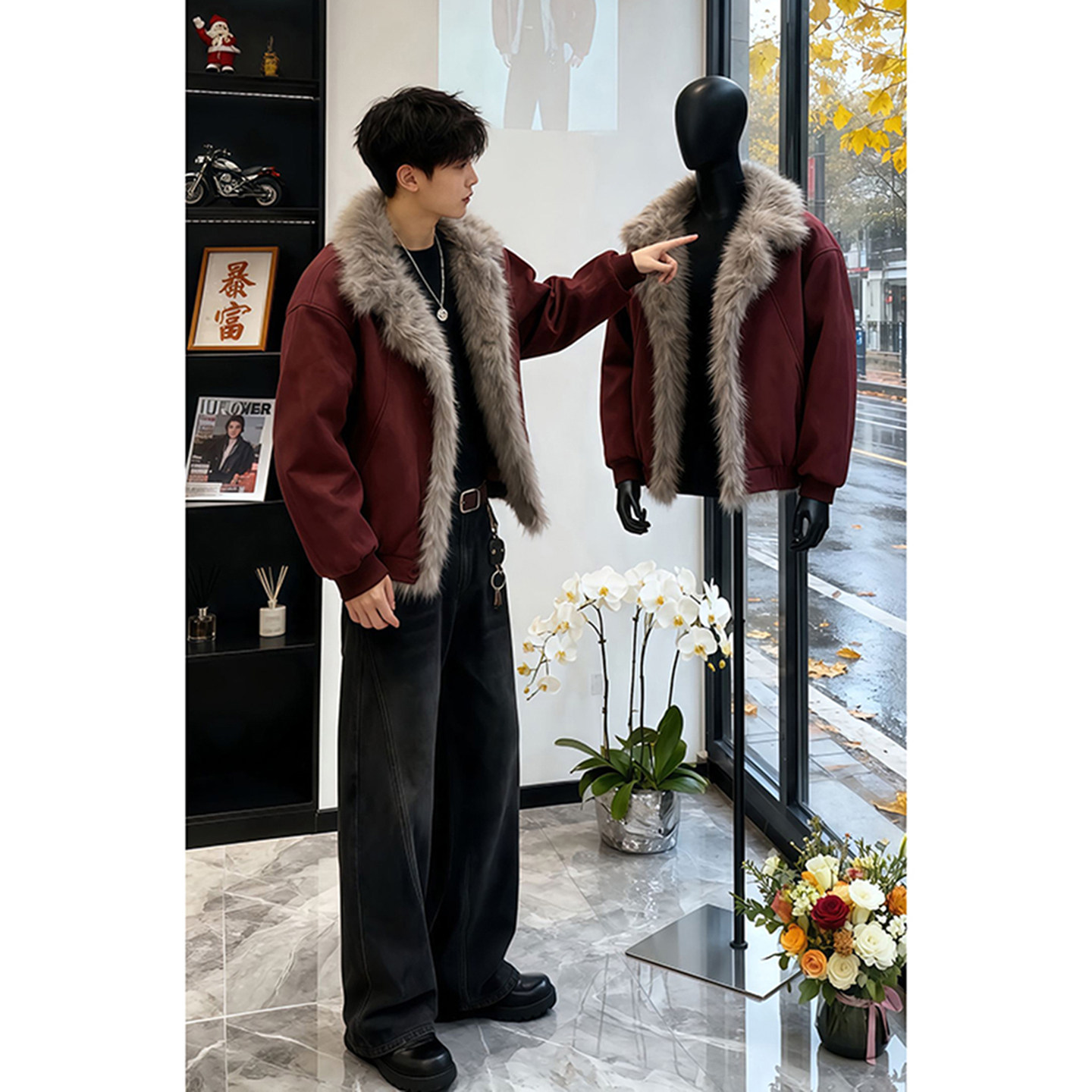 酒红色毛领座山雕棉服男款冬季高级感痞帅外套仿麂皮加绒加厚棉衣