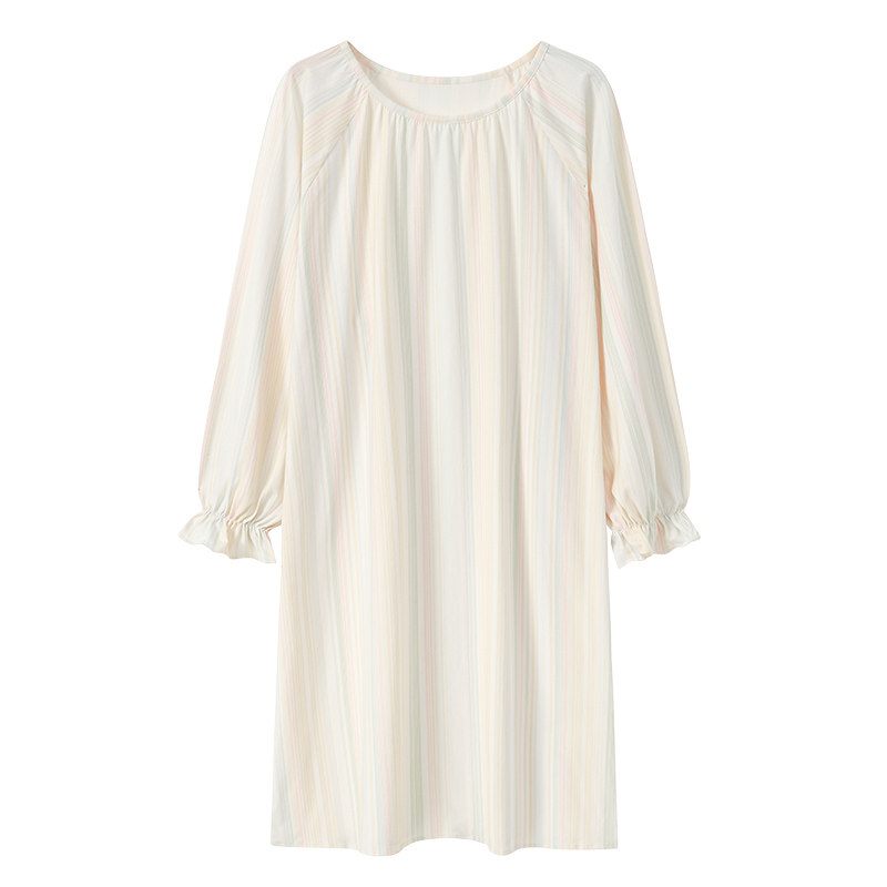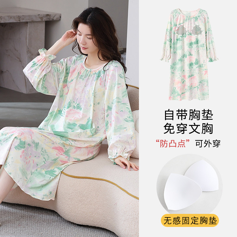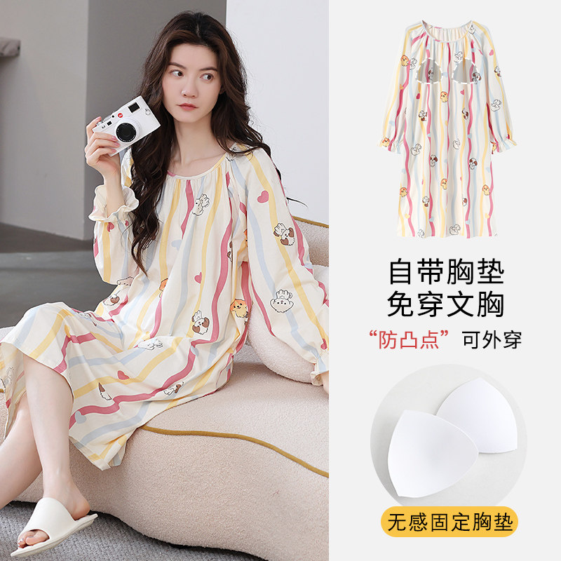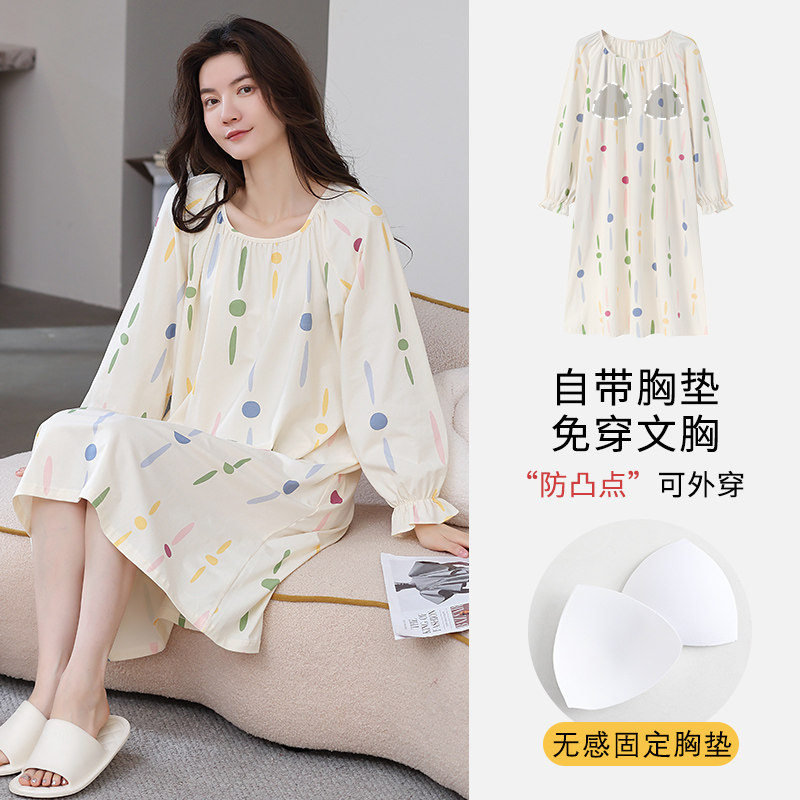 2025年纯棉睡裙女带胸垫春秋季薄款长袖大码中长款连衣裙睡衣夏天