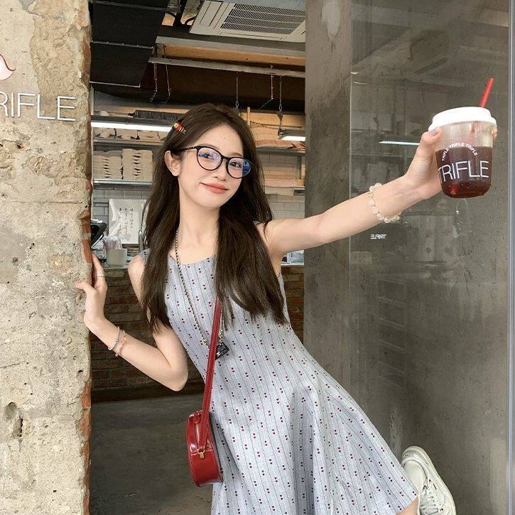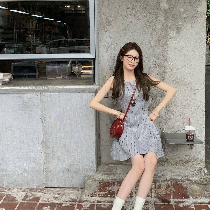 复古风圆领无袖收腰显瘦连衣裙女夏季法式灰色短款气质背心A字裙
