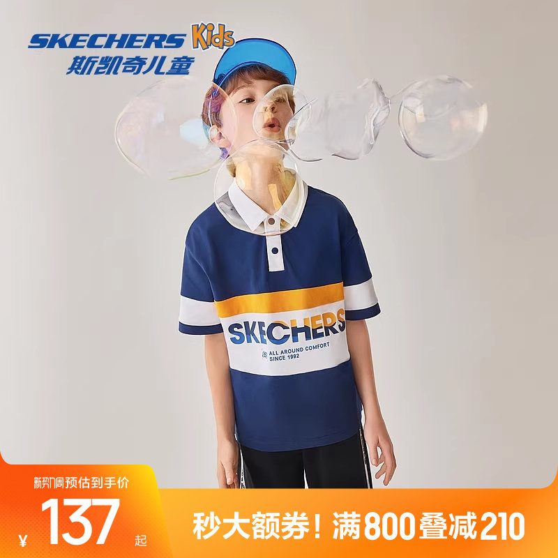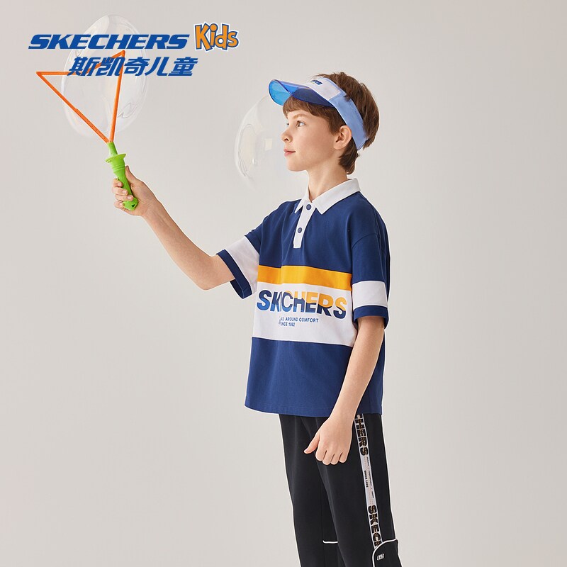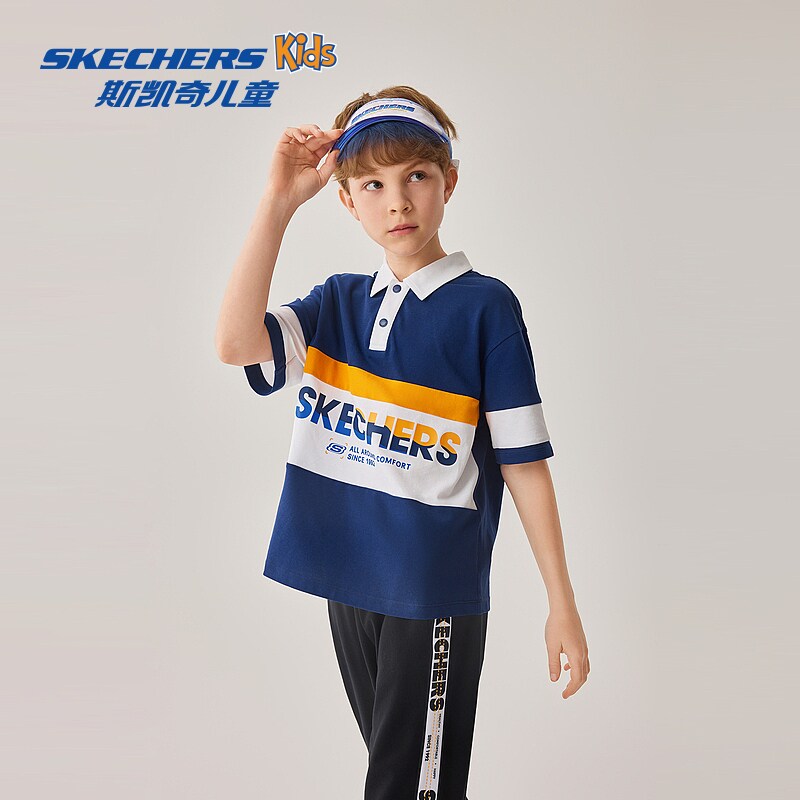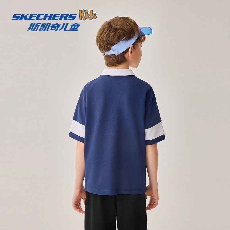 斯凯奇outlets童装男童梭织衬衫儿童T恤休闲蓝色透气翻领短袖衫