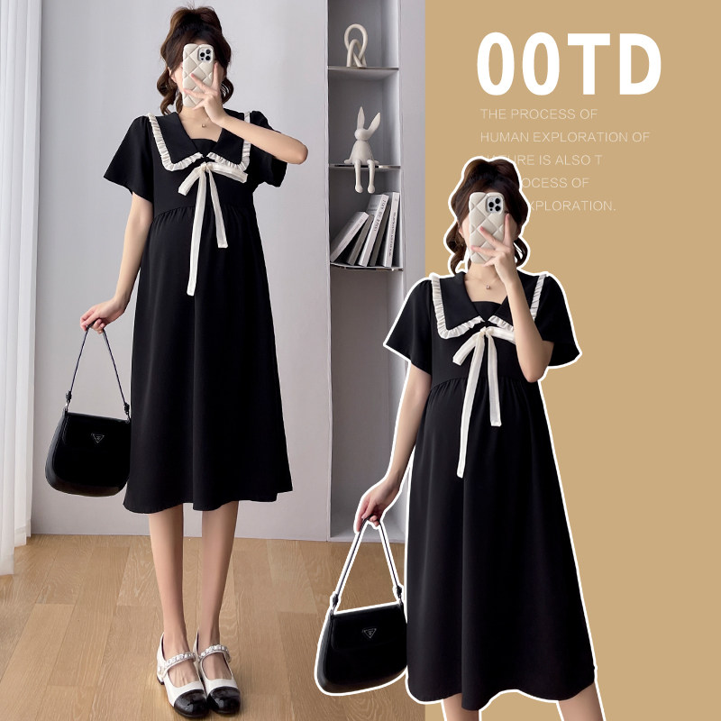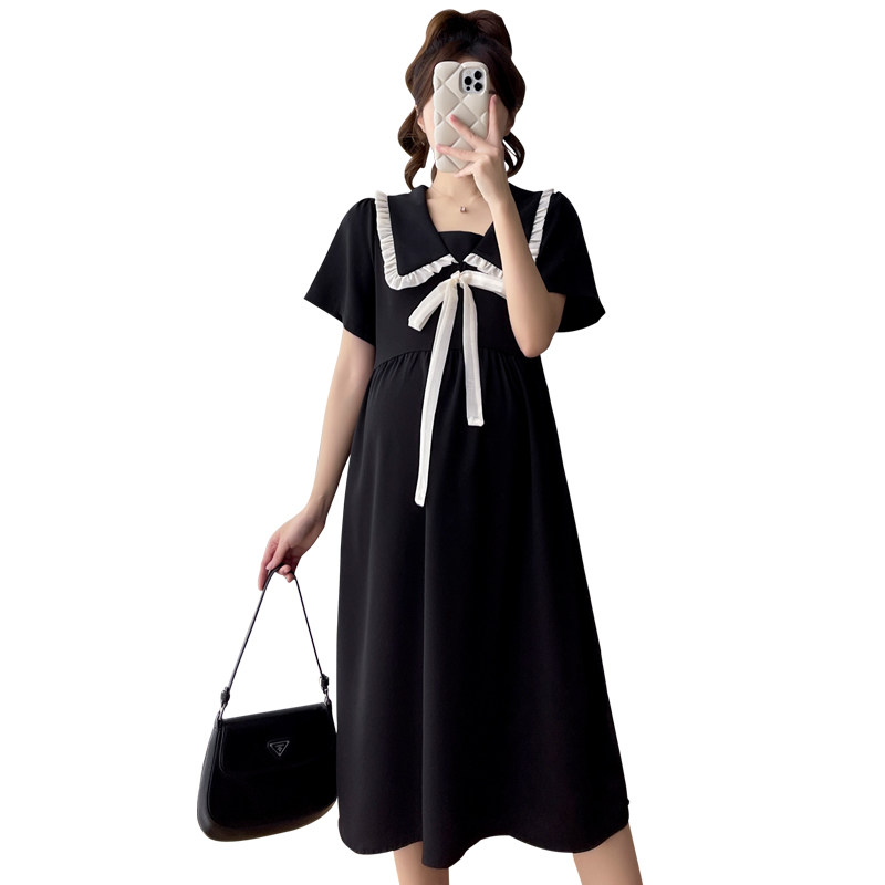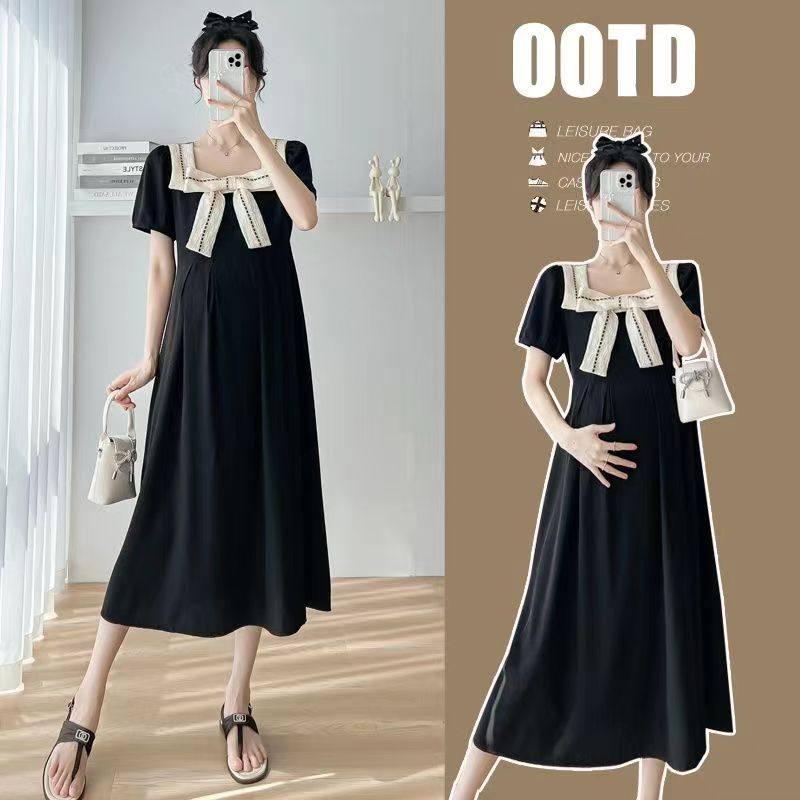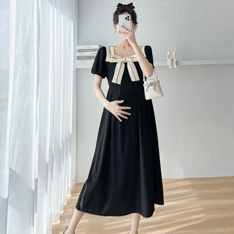 夏季高级感黑色孕妇裙宽松减龄中长款连衣裙女时尚辣妈孕晚期裙子