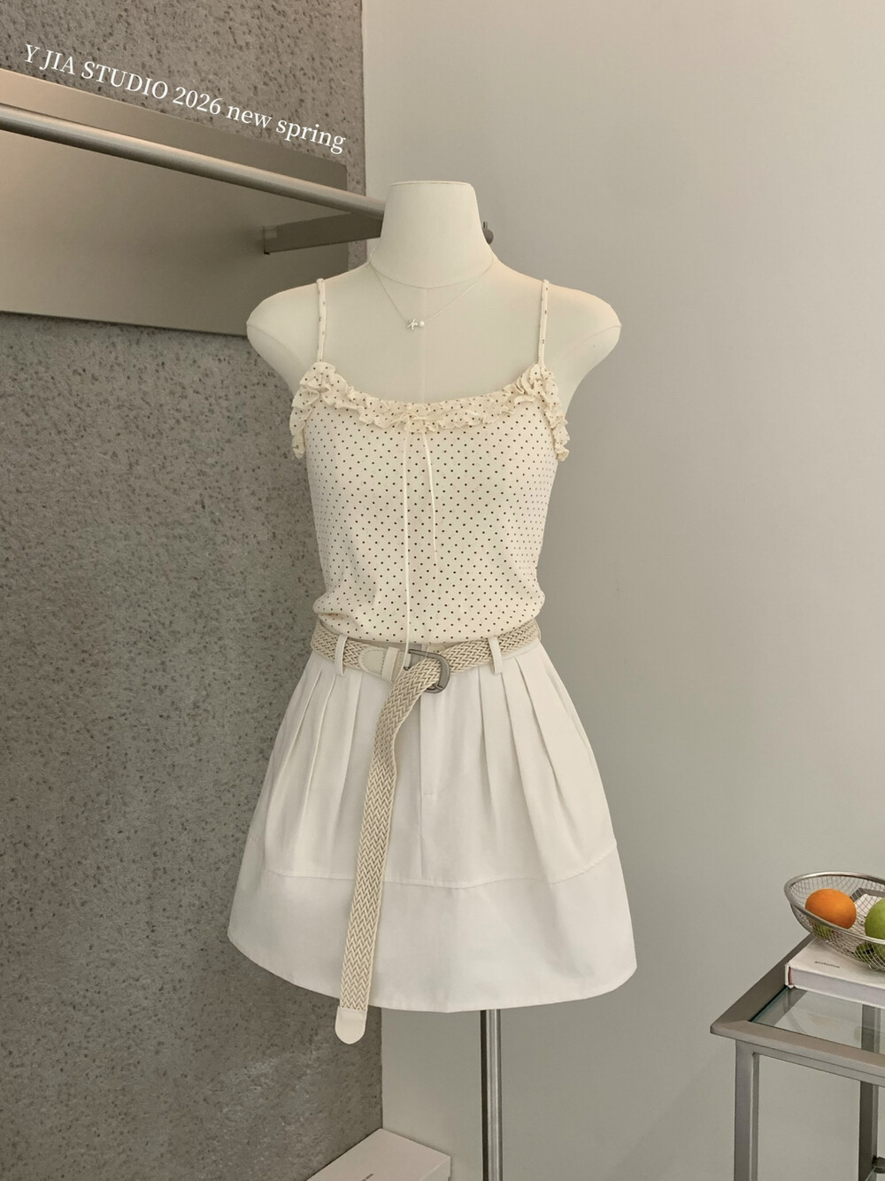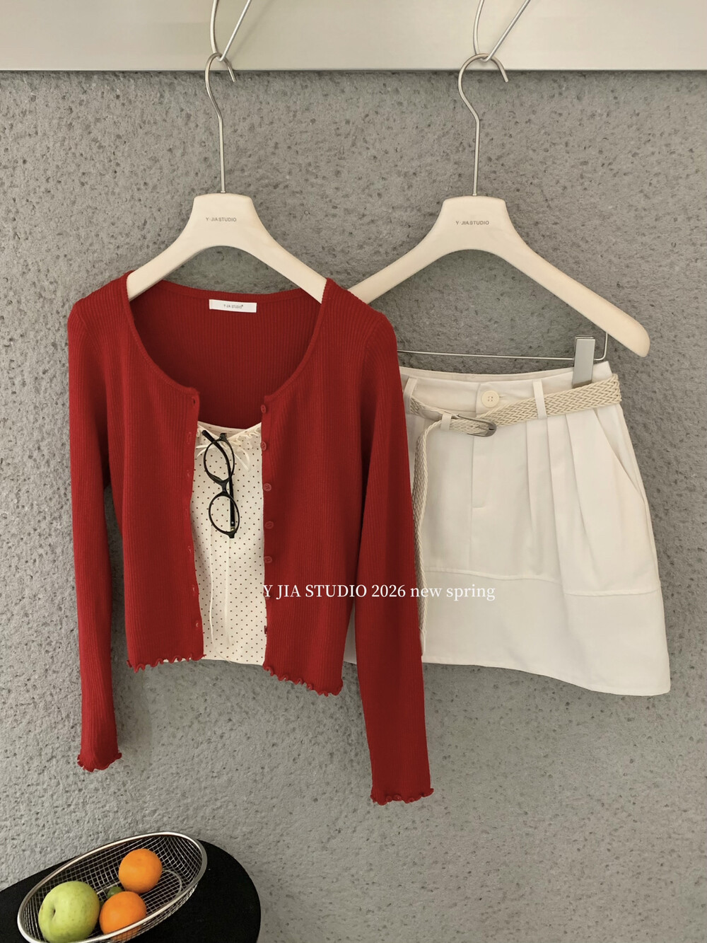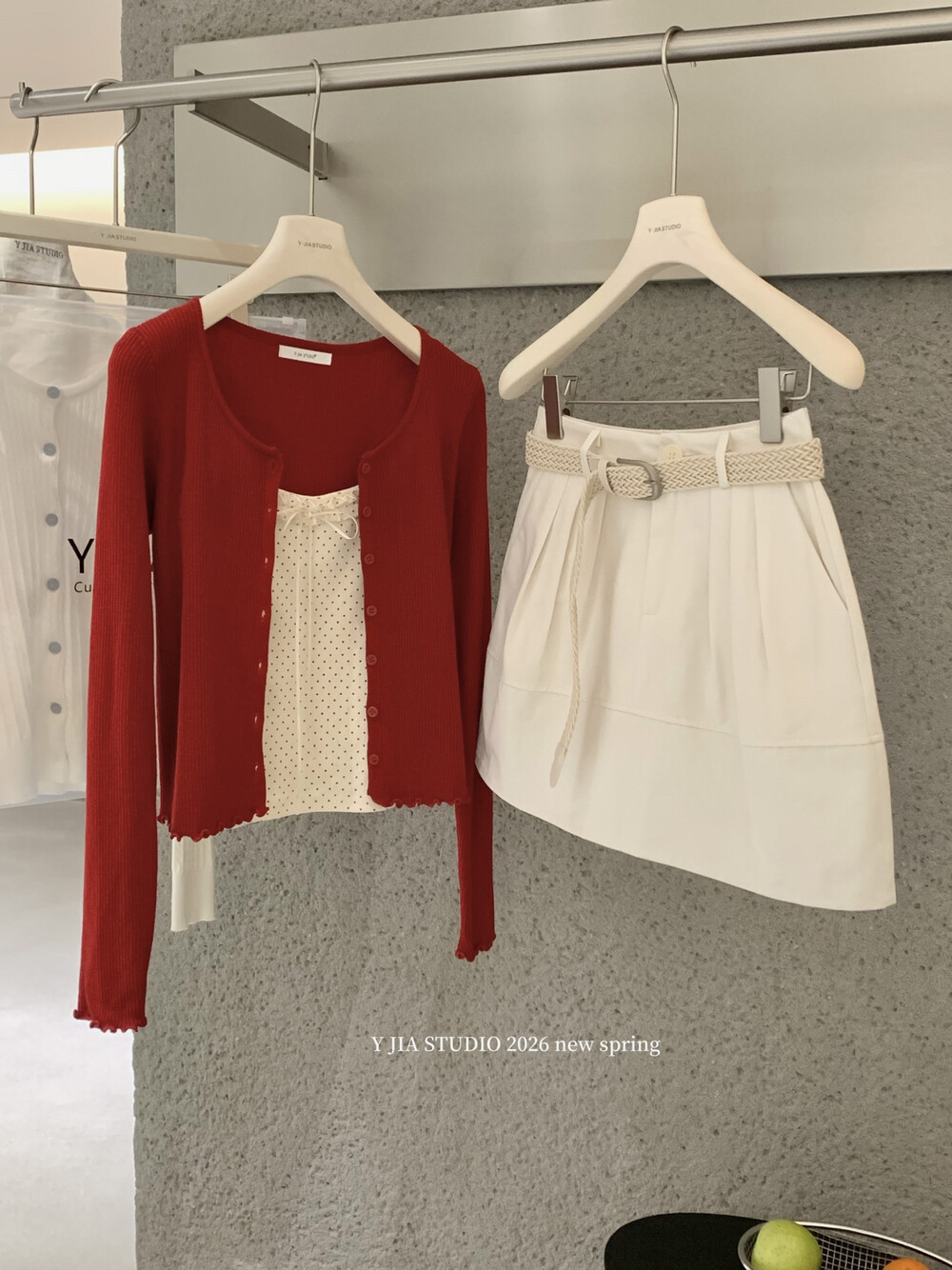Y.JIA 伊嘉早春新款红色针织开衫+波点荷叶边吊带+花苞裙三件套装