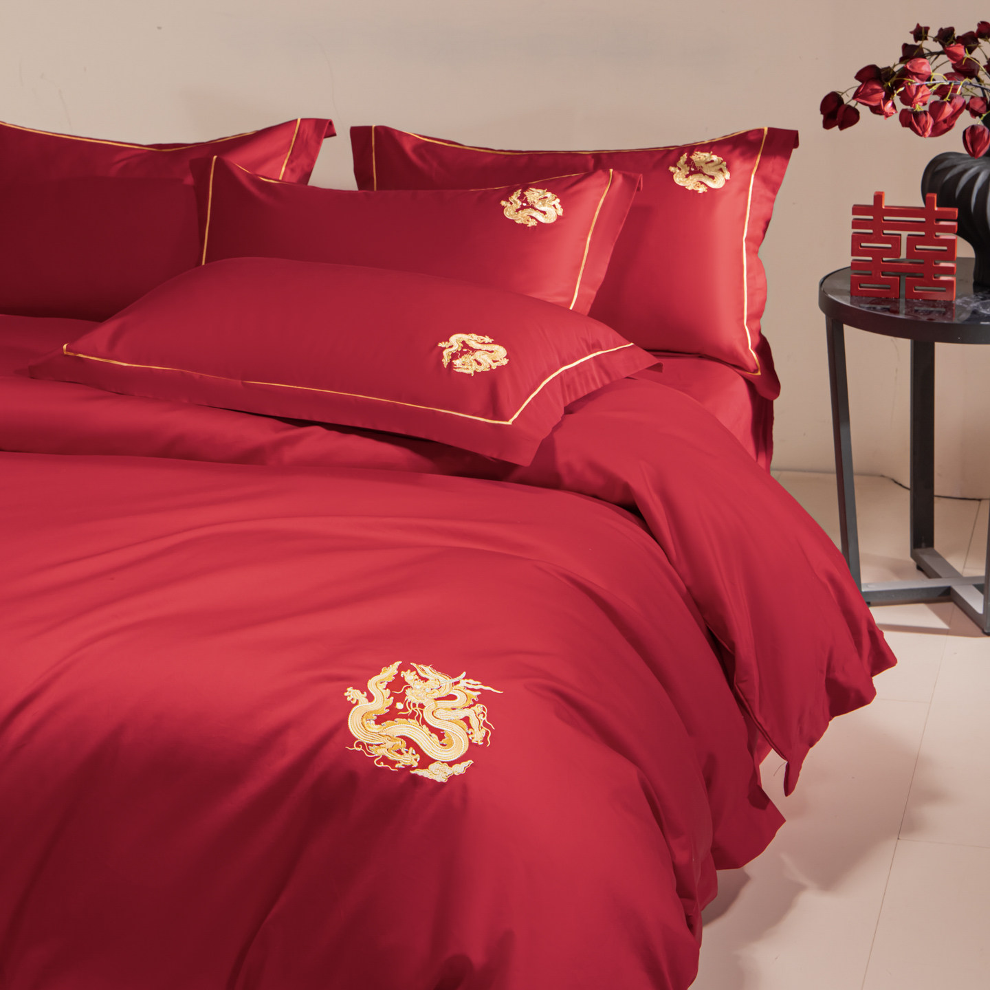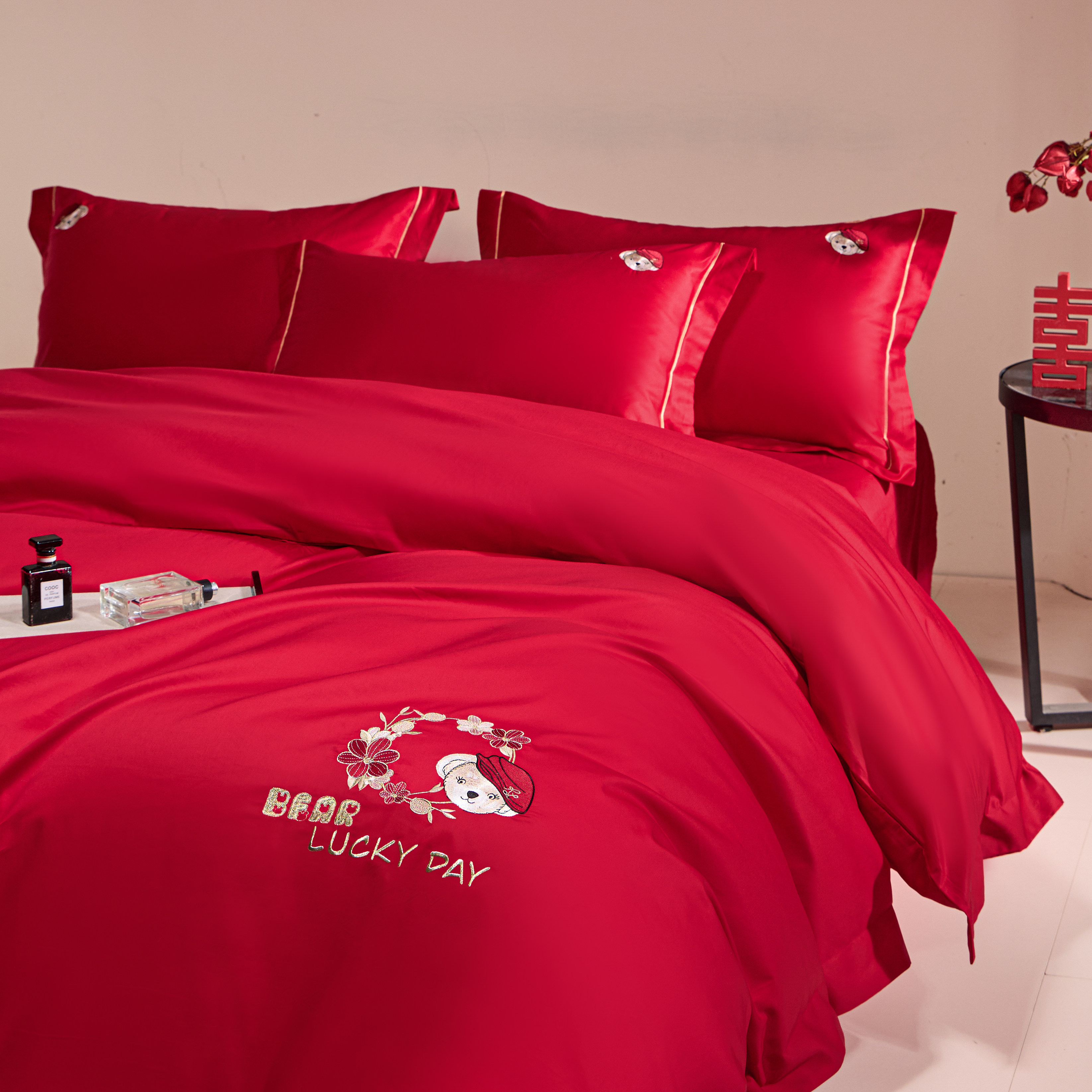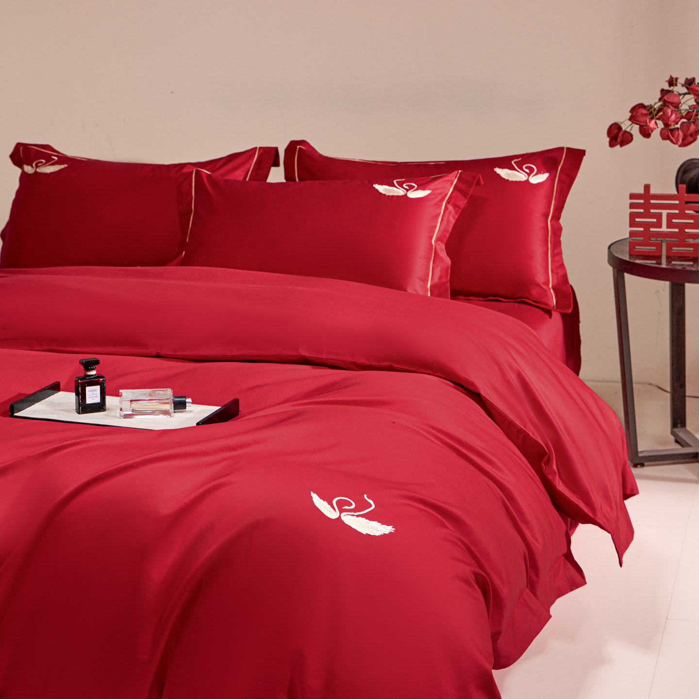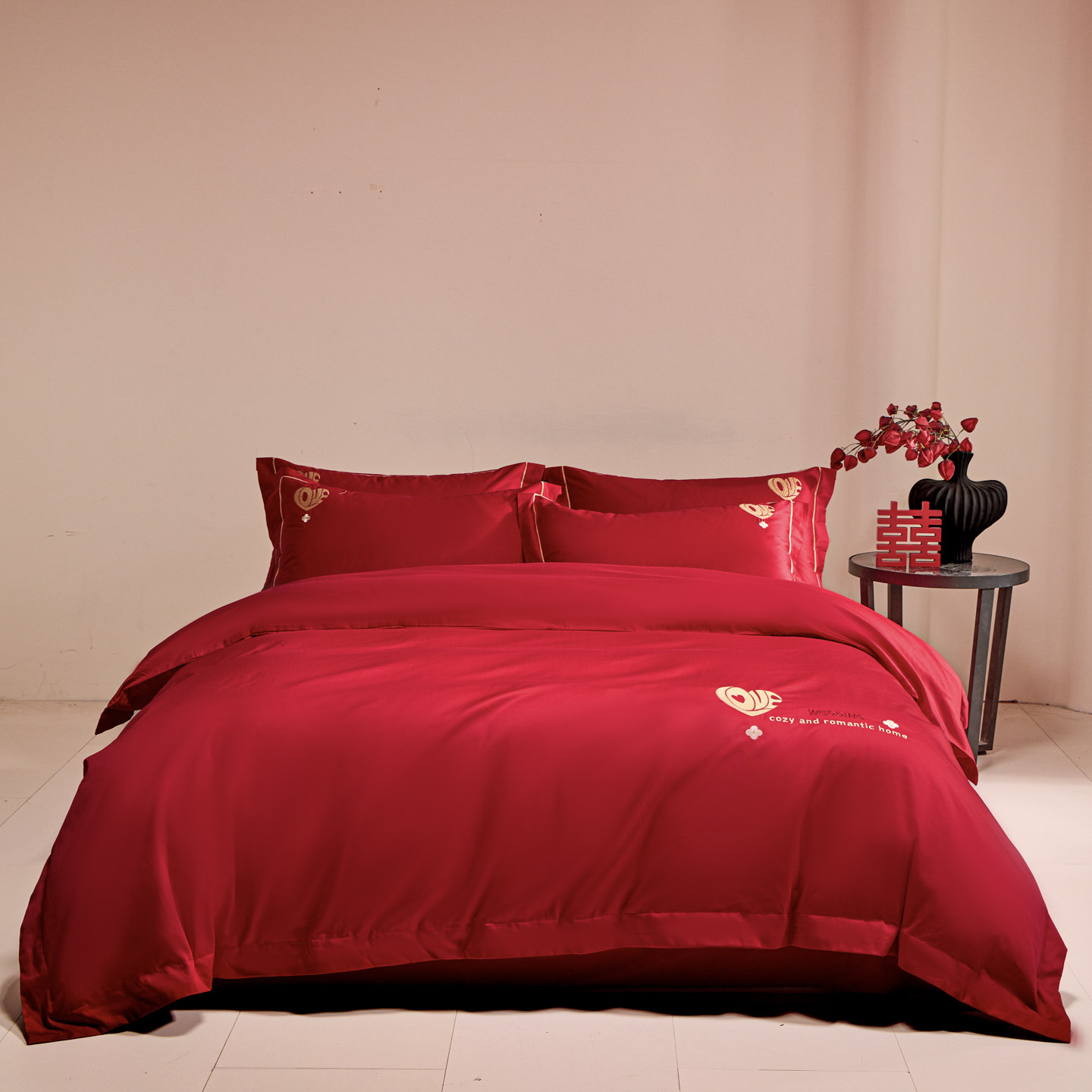 年轻人简约婚庆四件套大红色喜被高级感刺绣被套纯棉结婚床上用品