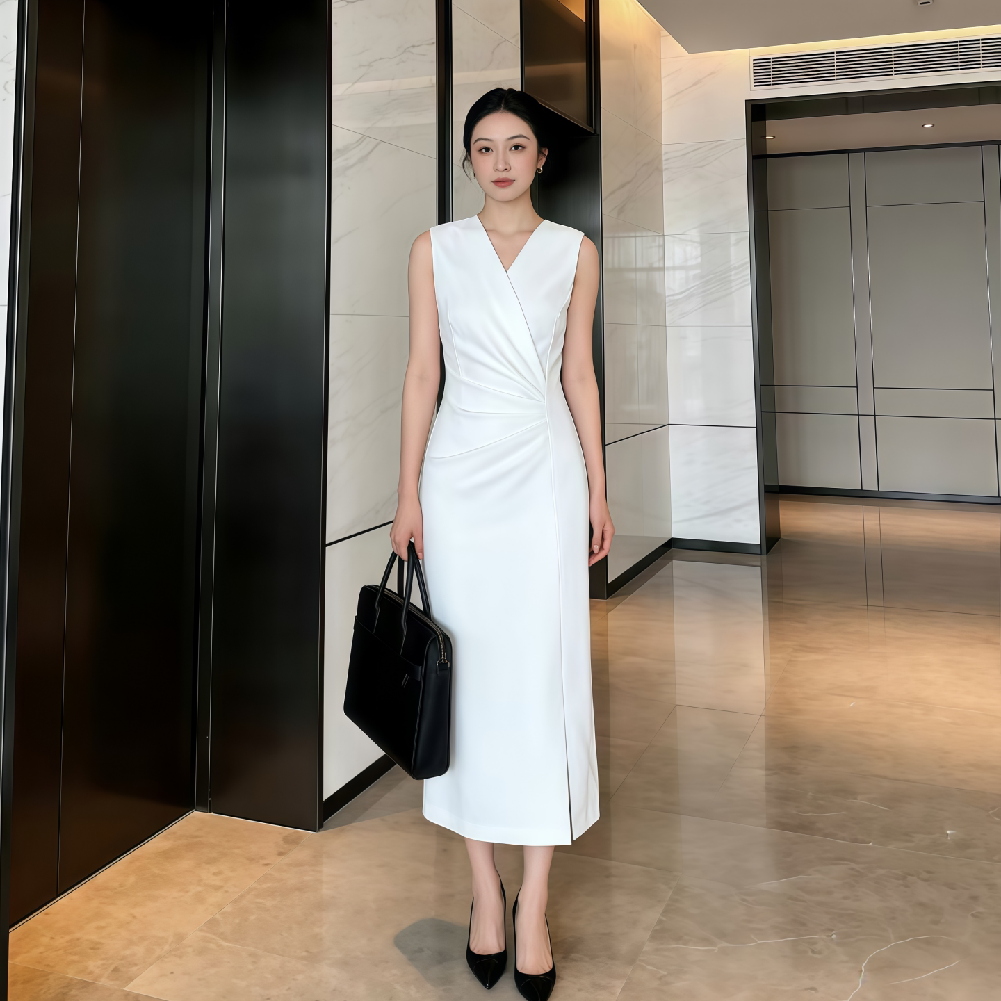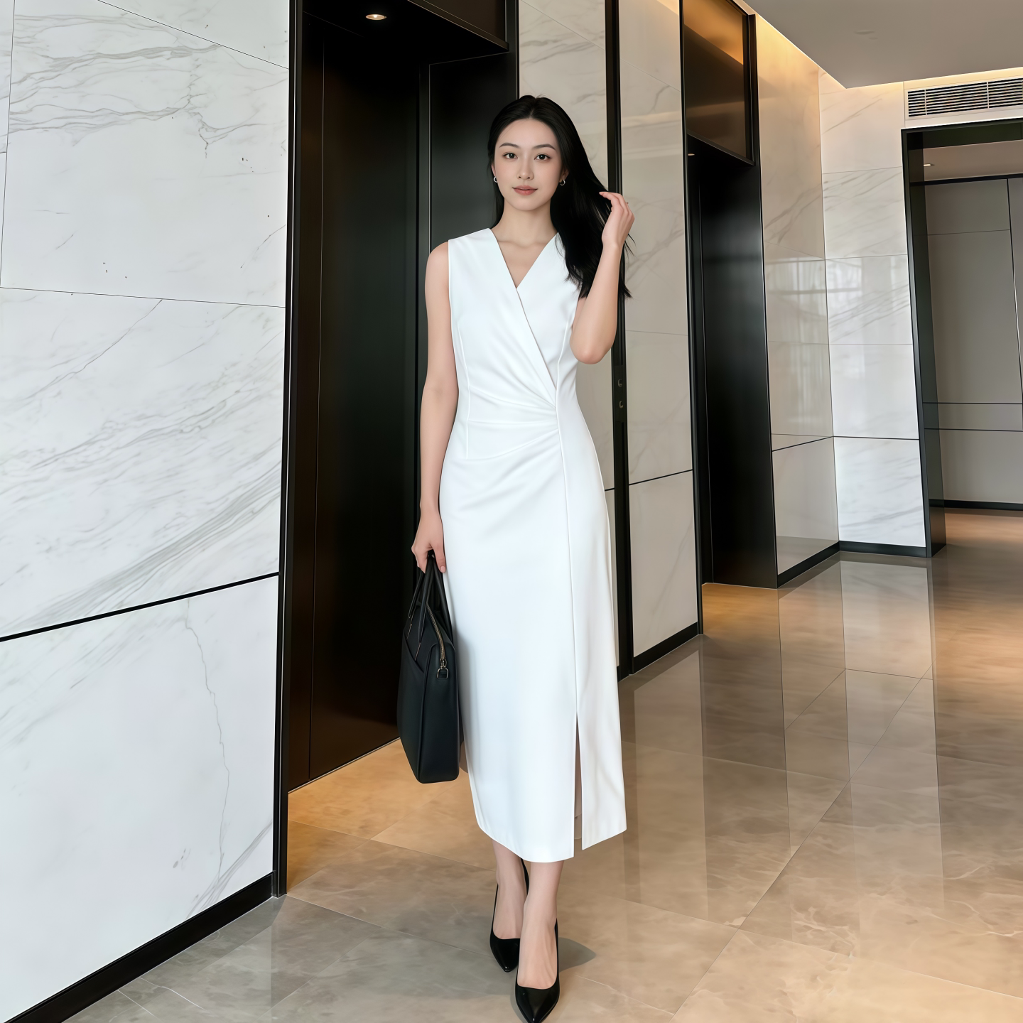 春夏季新款宴会晚装轻熟V领长袖白裙中长裙高级名媛连衣裙礼服女