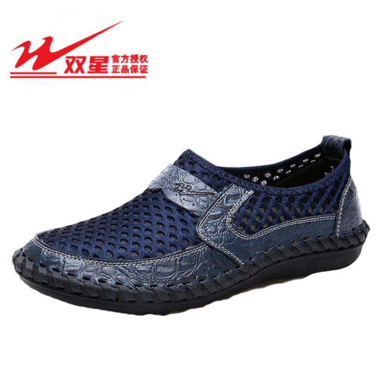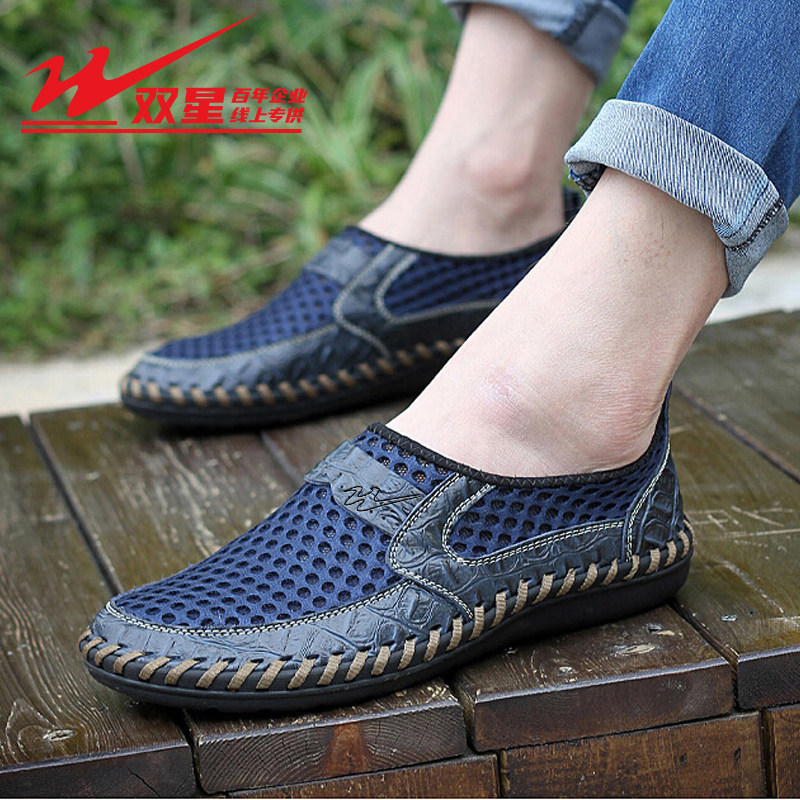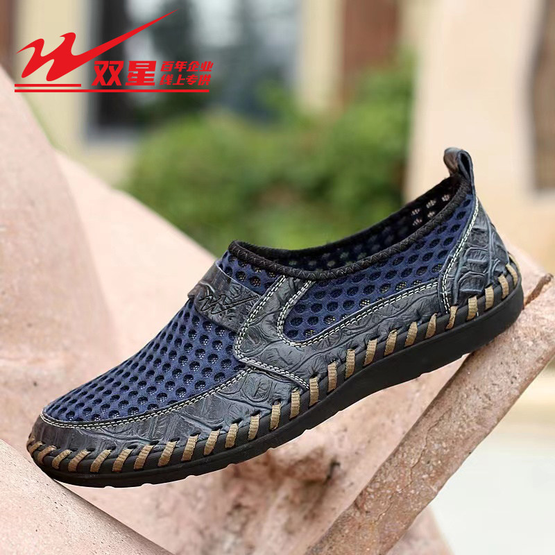双星男鞋真牛皮手工网面凉鞋男透气男凉鞋男一脚蹬老年人网面夏季