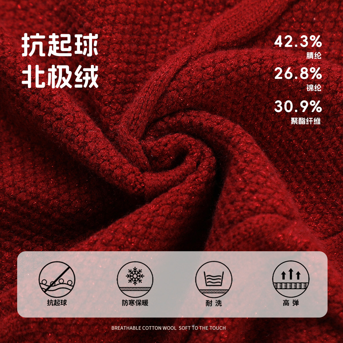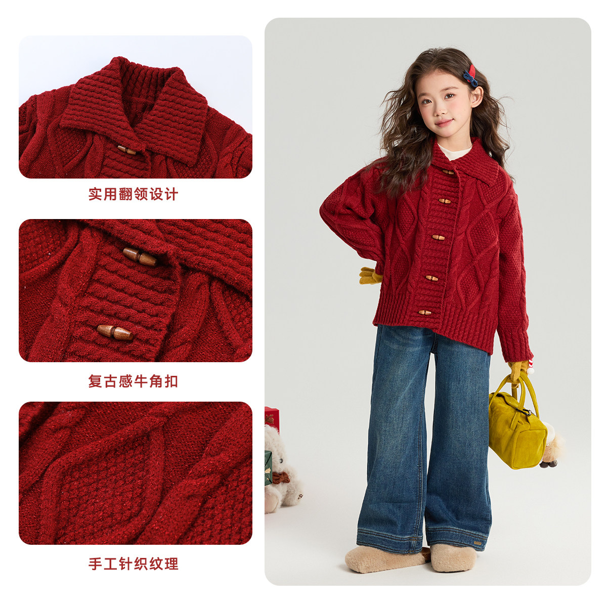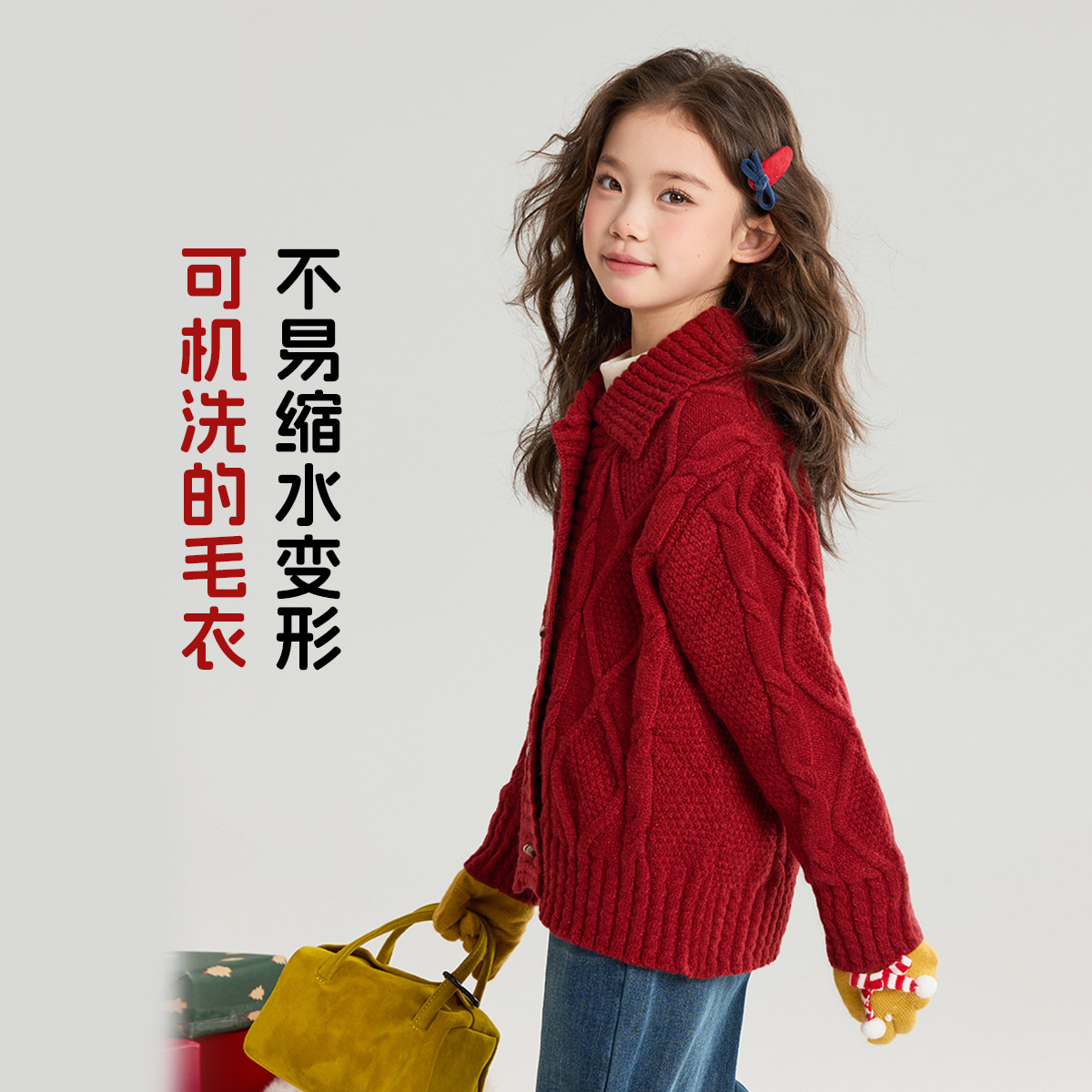 沫沫童装冬装女童拜年服2026季新款儿童加厚新年衣服红色开衫毛衣