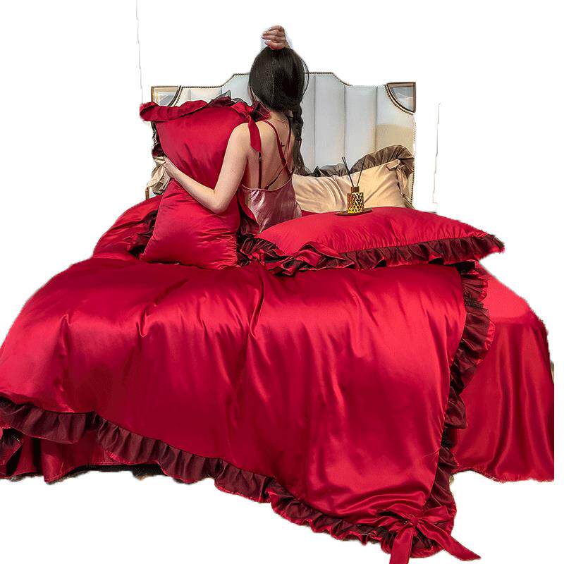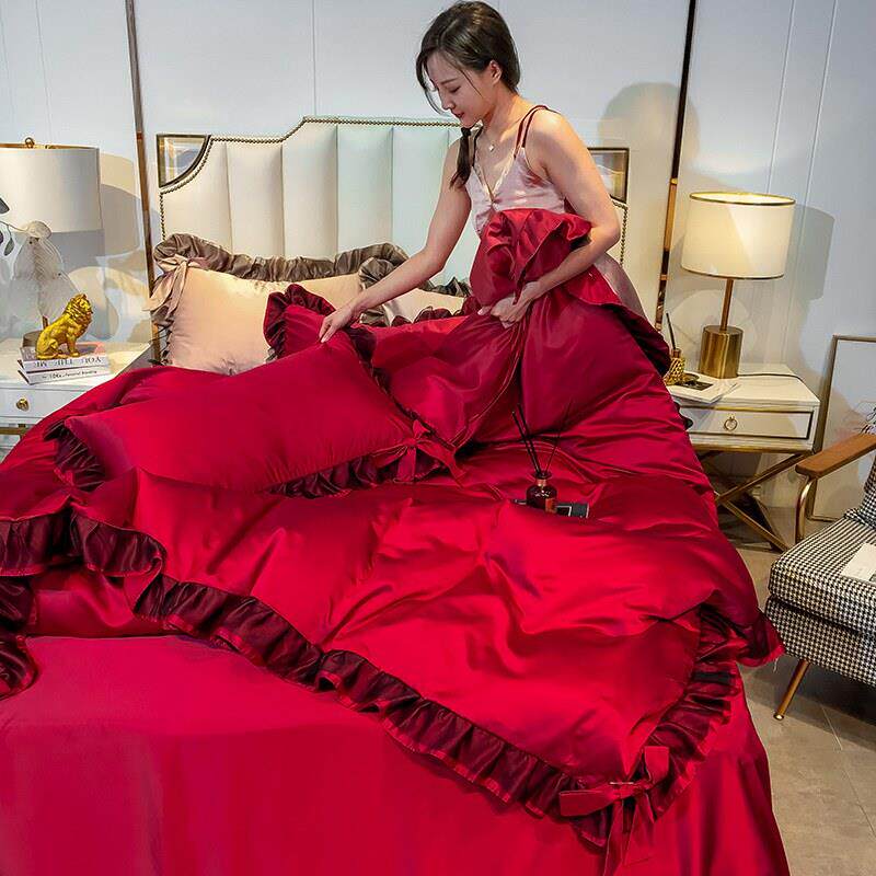 婚庆冰丝四件套结婚大红色床单被套床裙1.8M床笠婚房新婚床上用品