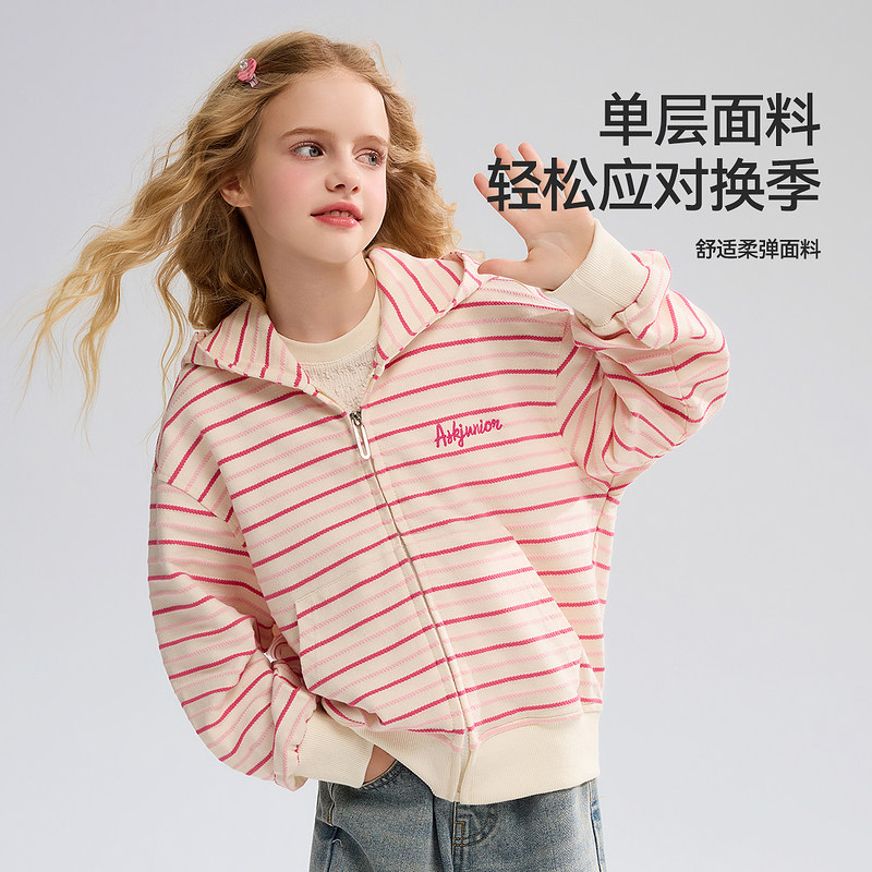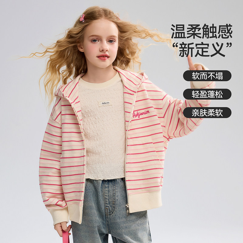 ASK儿童春装连帽卫衣女童外套2026春秋新款女孩甜美条纹开衫春季