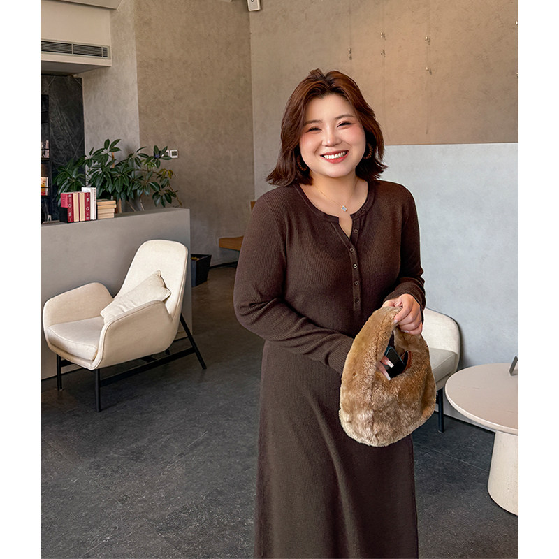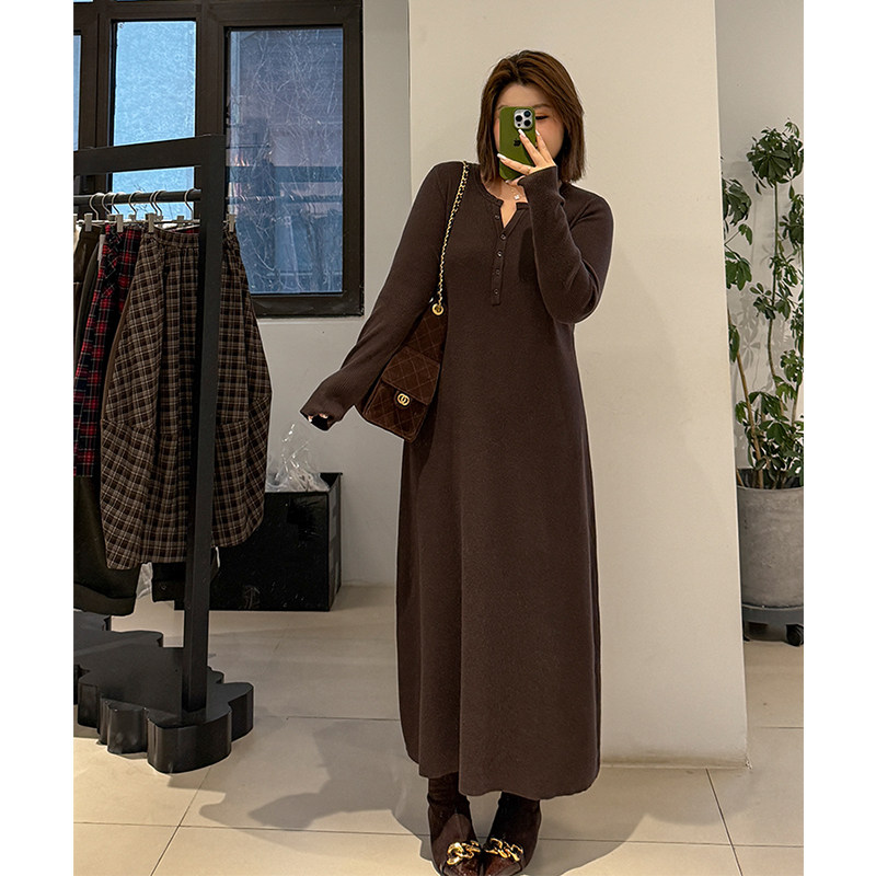 胖mm秋冬显瘦针织连衣裙木子理想大码女装半开襟收腰长袖长裙子