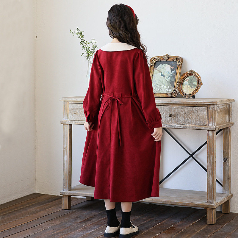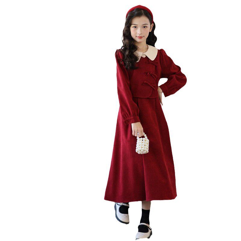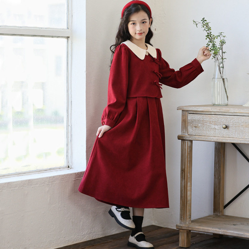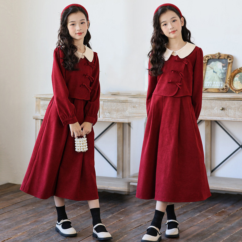 女童红色连衣裙秋冬复古长裙中大童冬裙中国风公主裙加绒儿童裙子