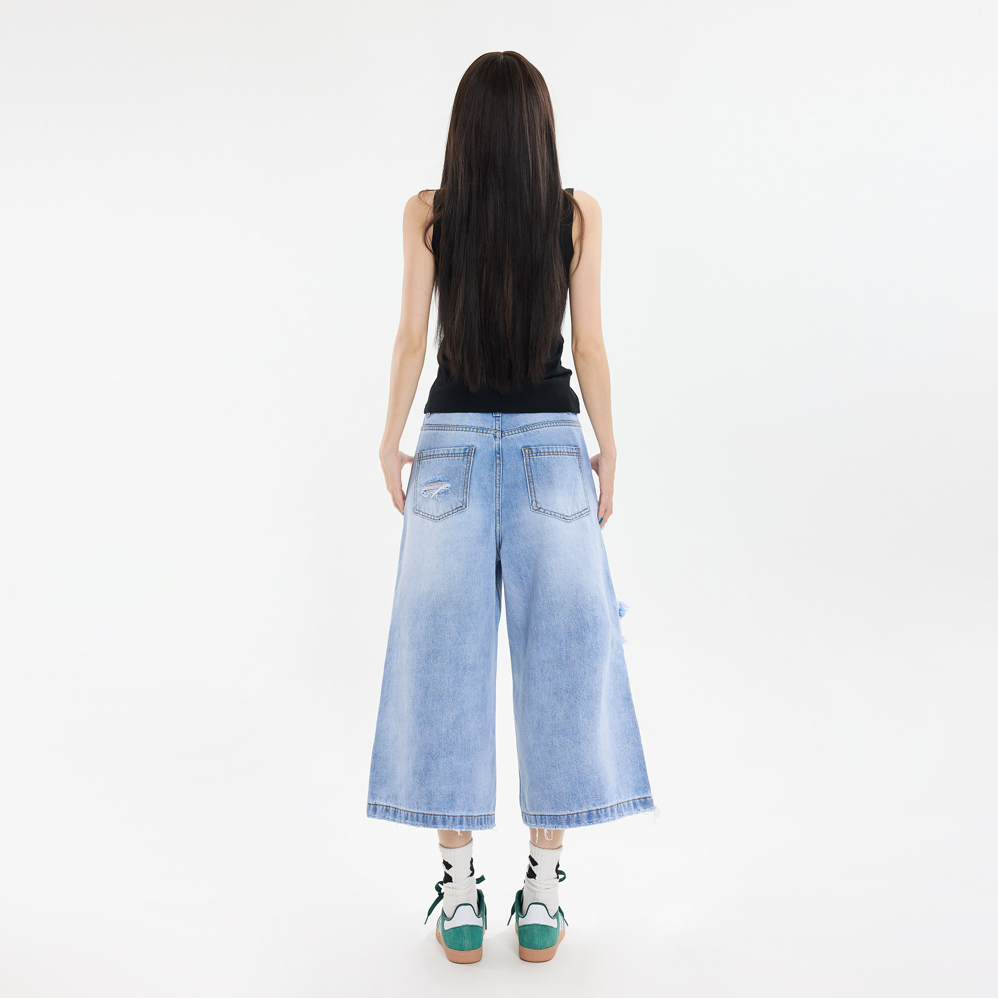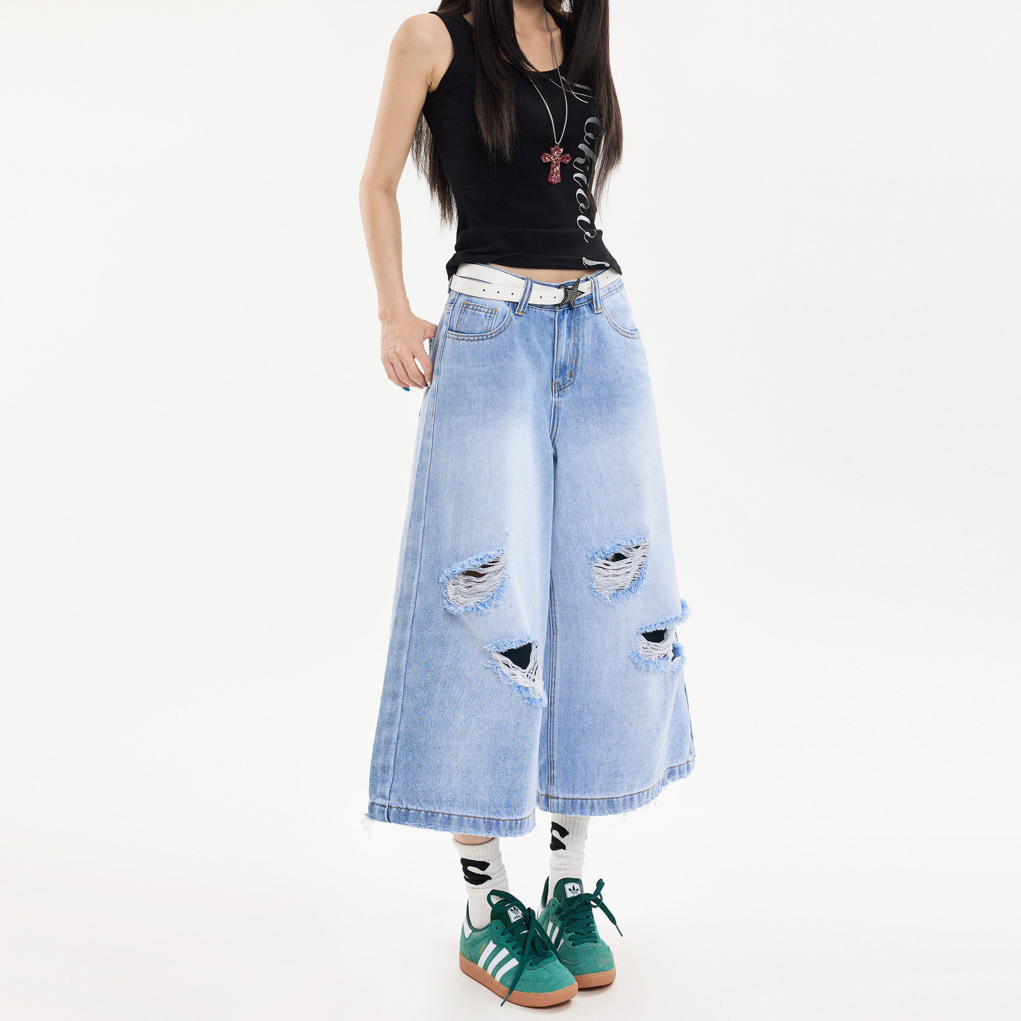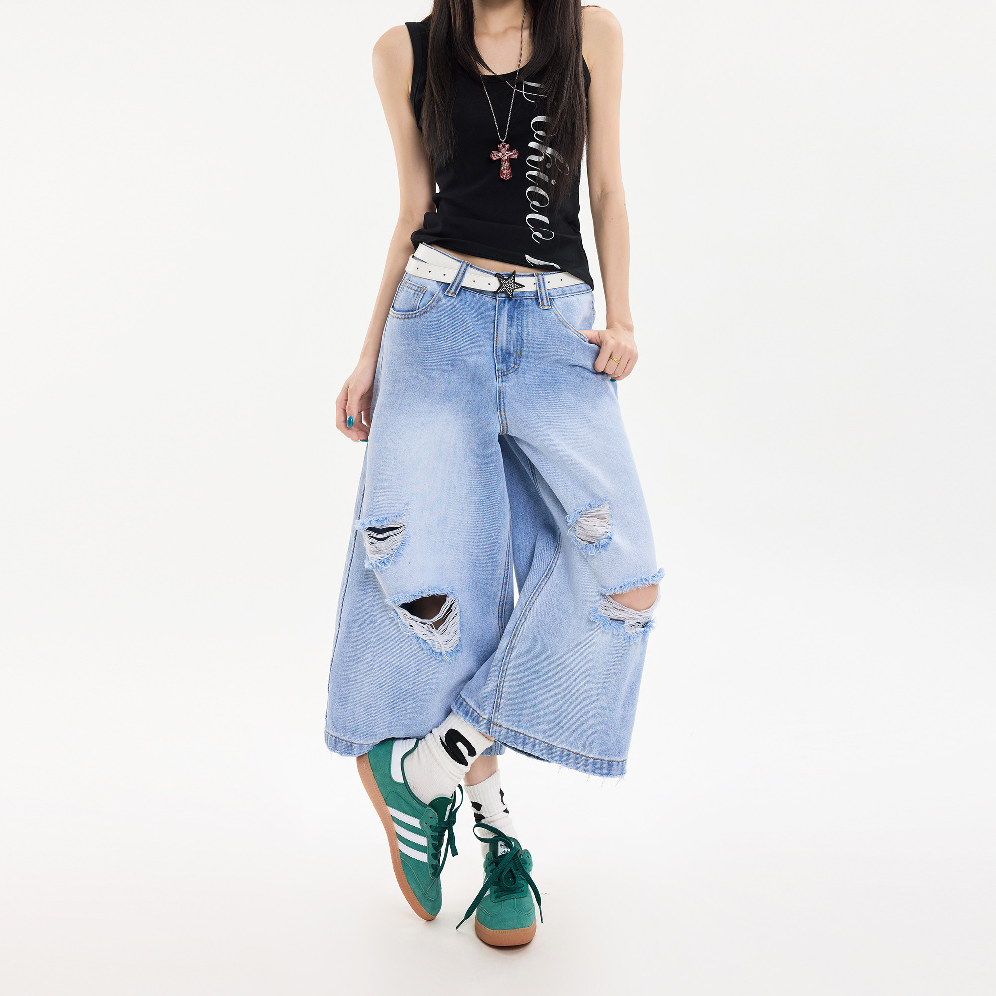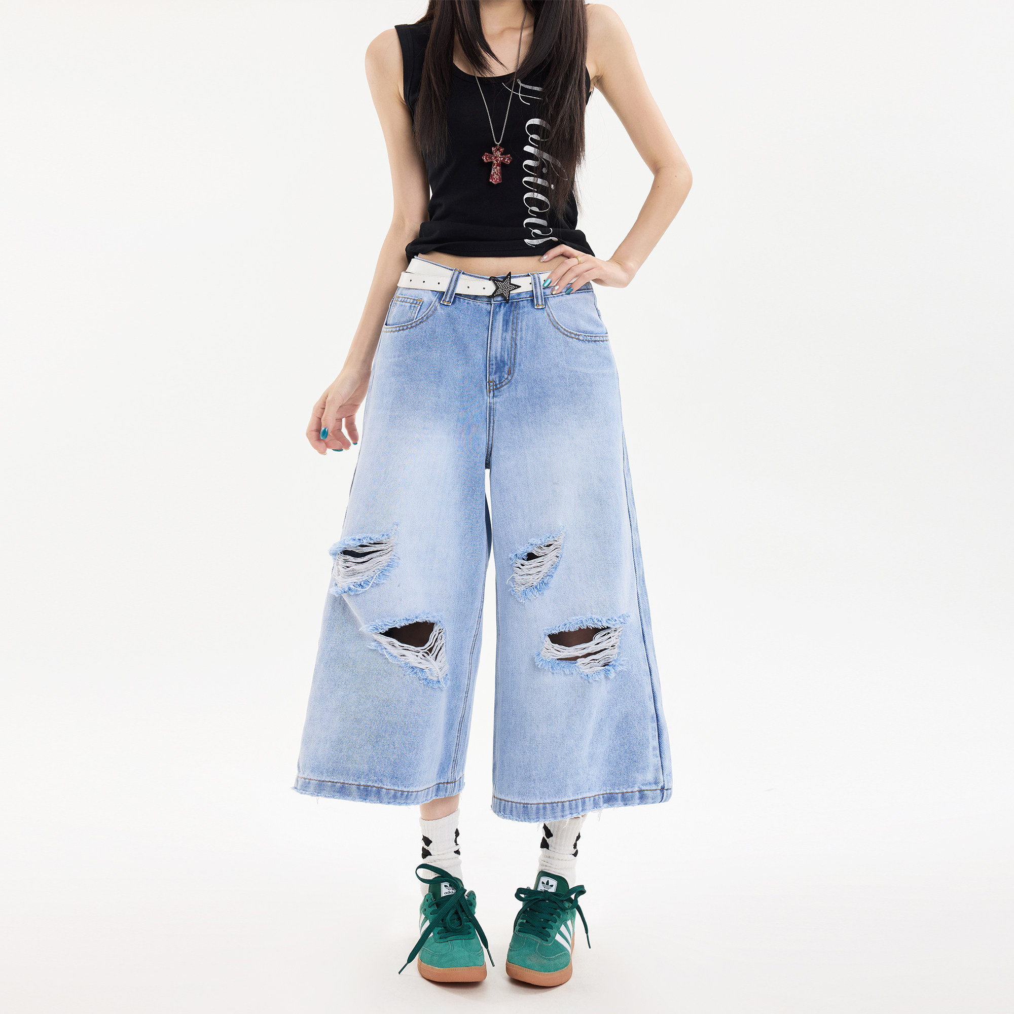 2025夏季薄款烟灰色七分牛仔裤女款小个子梨形身材中裤破洞阔腿裤