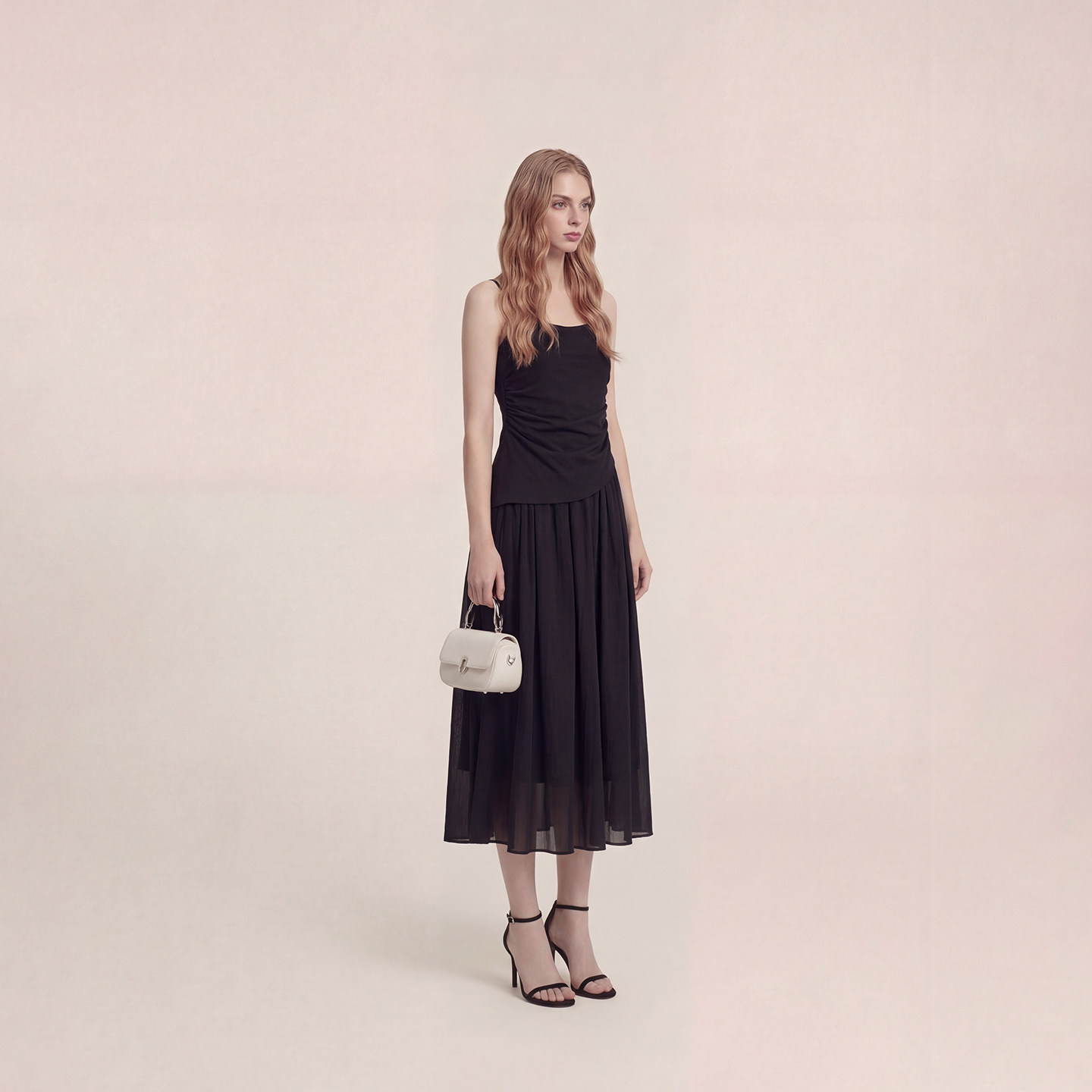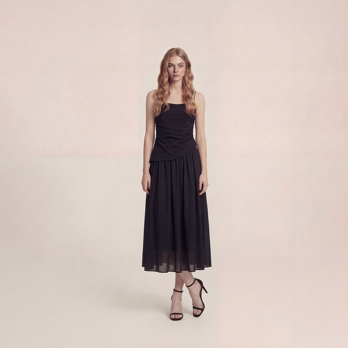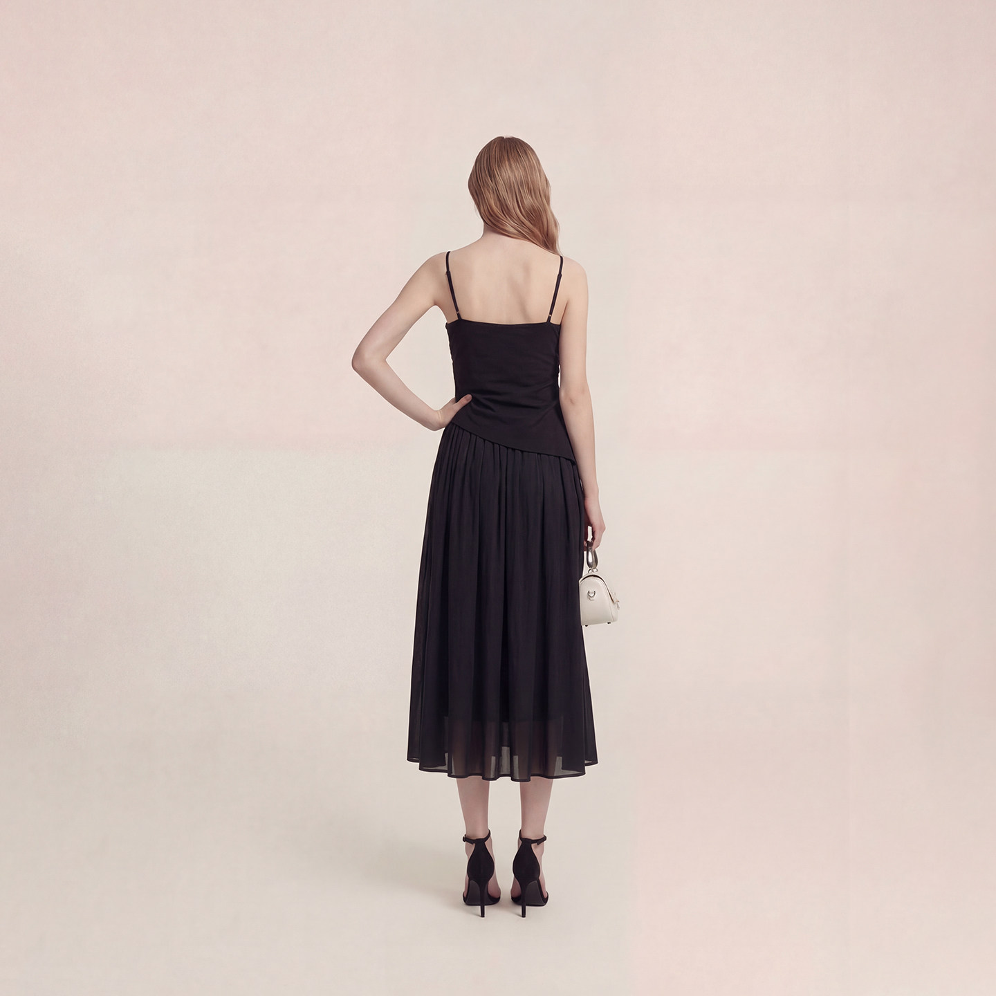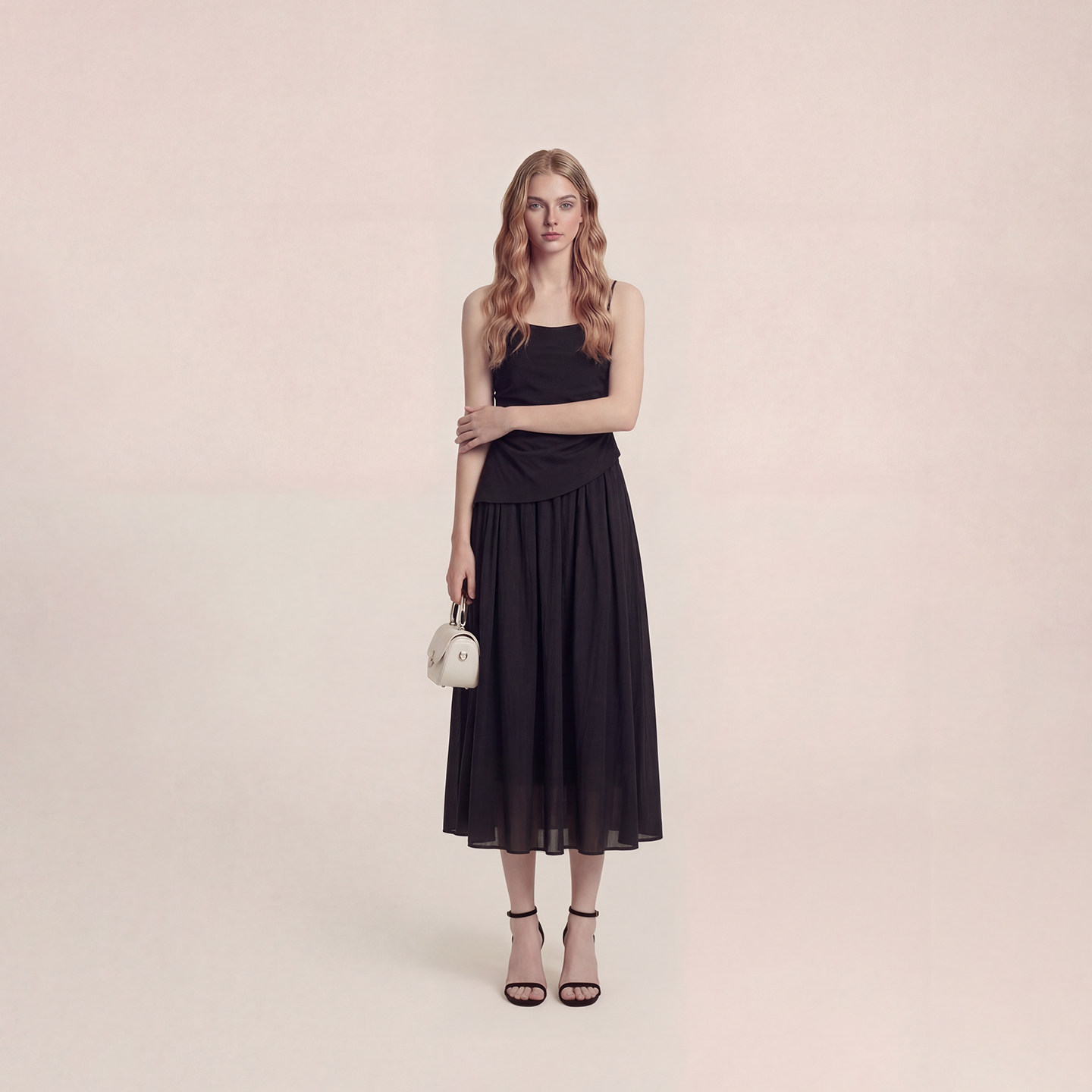 拉夏贝尔中长款收腰度假风温柔仙女裙法式极简风黑色吊带连衣裙女