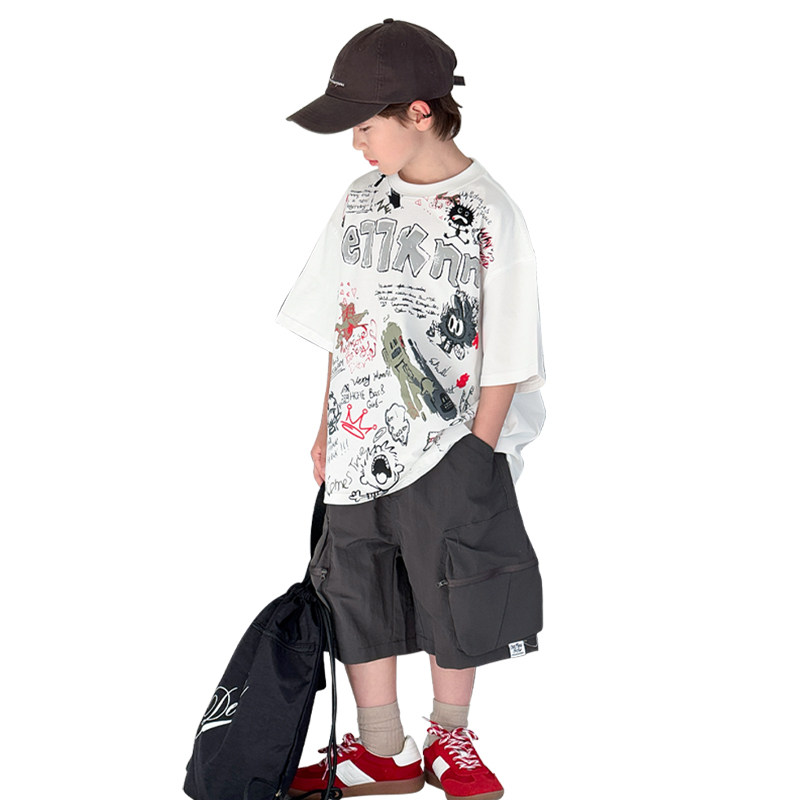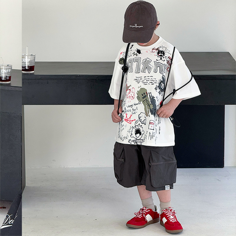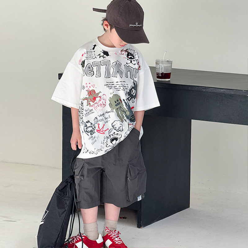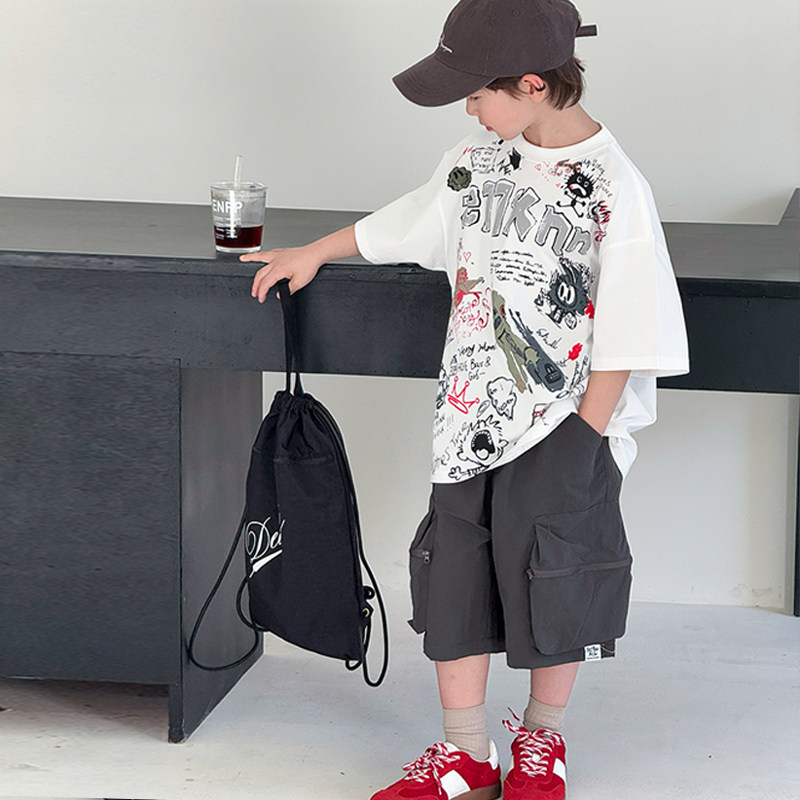 男童韩版短袖套装2026新款潮儿童涂鸦T恤夏季中大童半袖上衣痞帅T