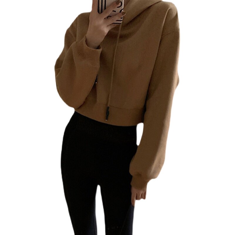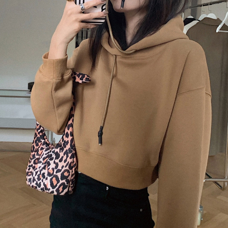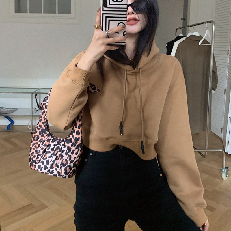 短款连帽卫衣女款秋冬加绒加厚新款小个子套头宽松卡其色长袖上衣
