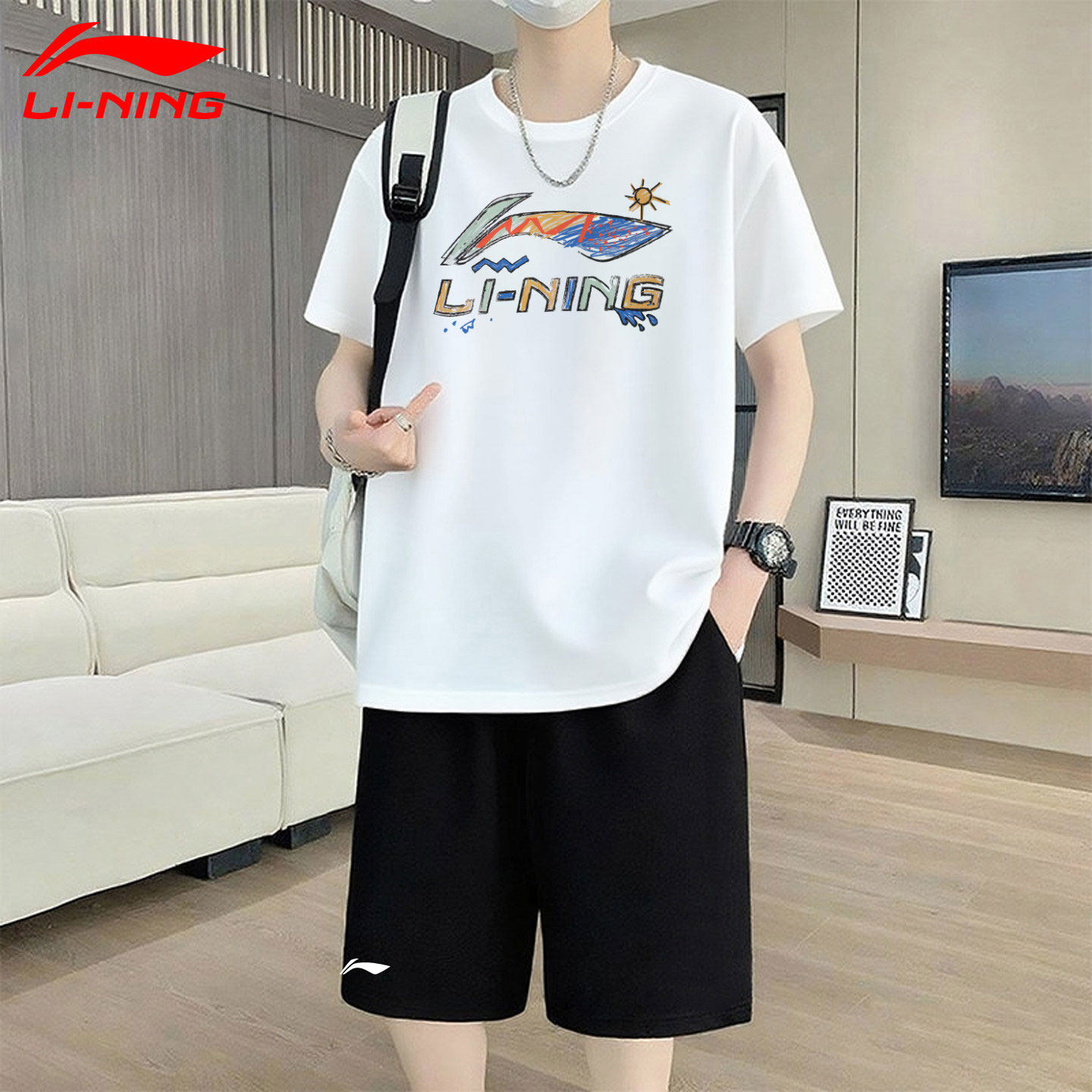 李宁黑色运动套装男夏季新款速干短裤短袖棉质大码青少年学生套装