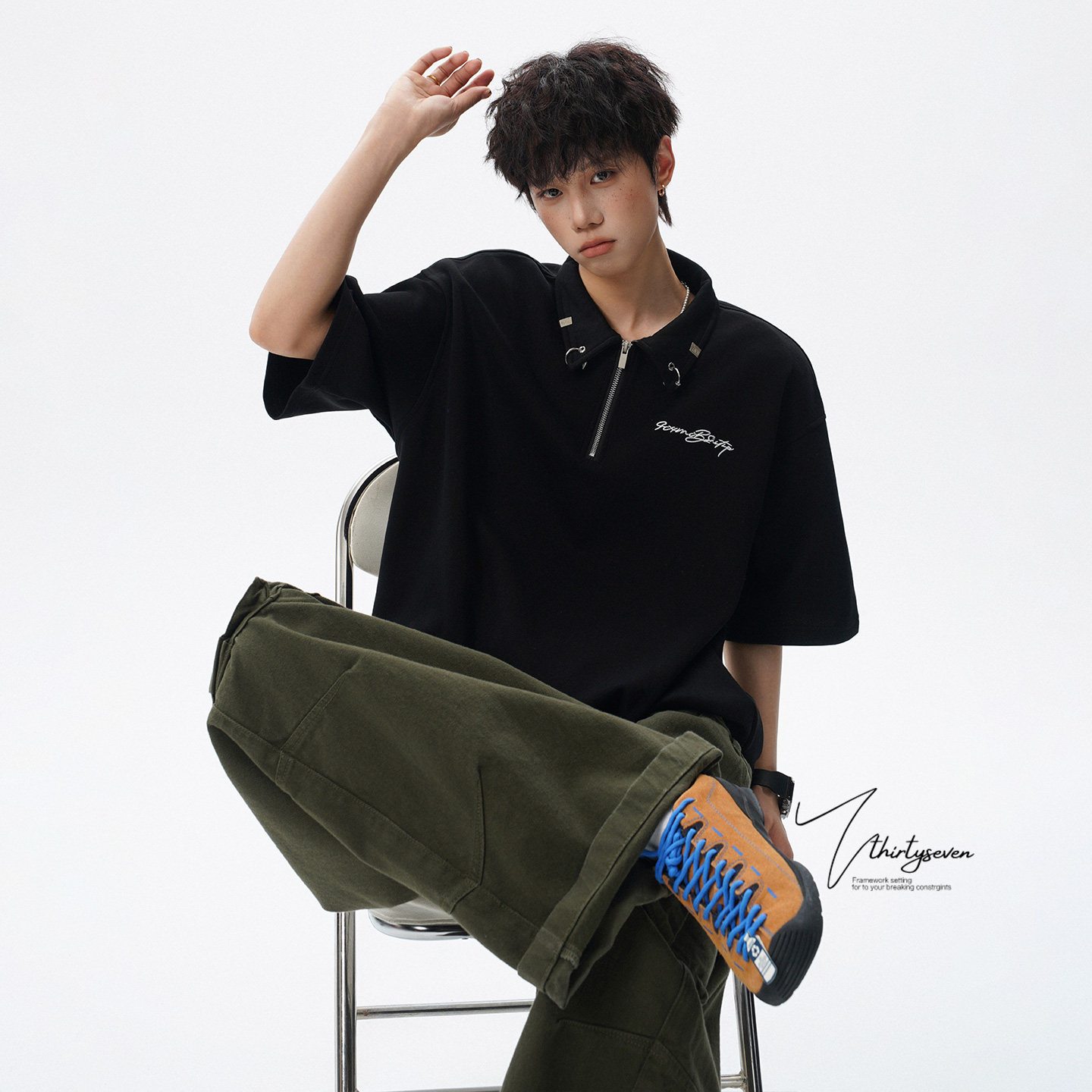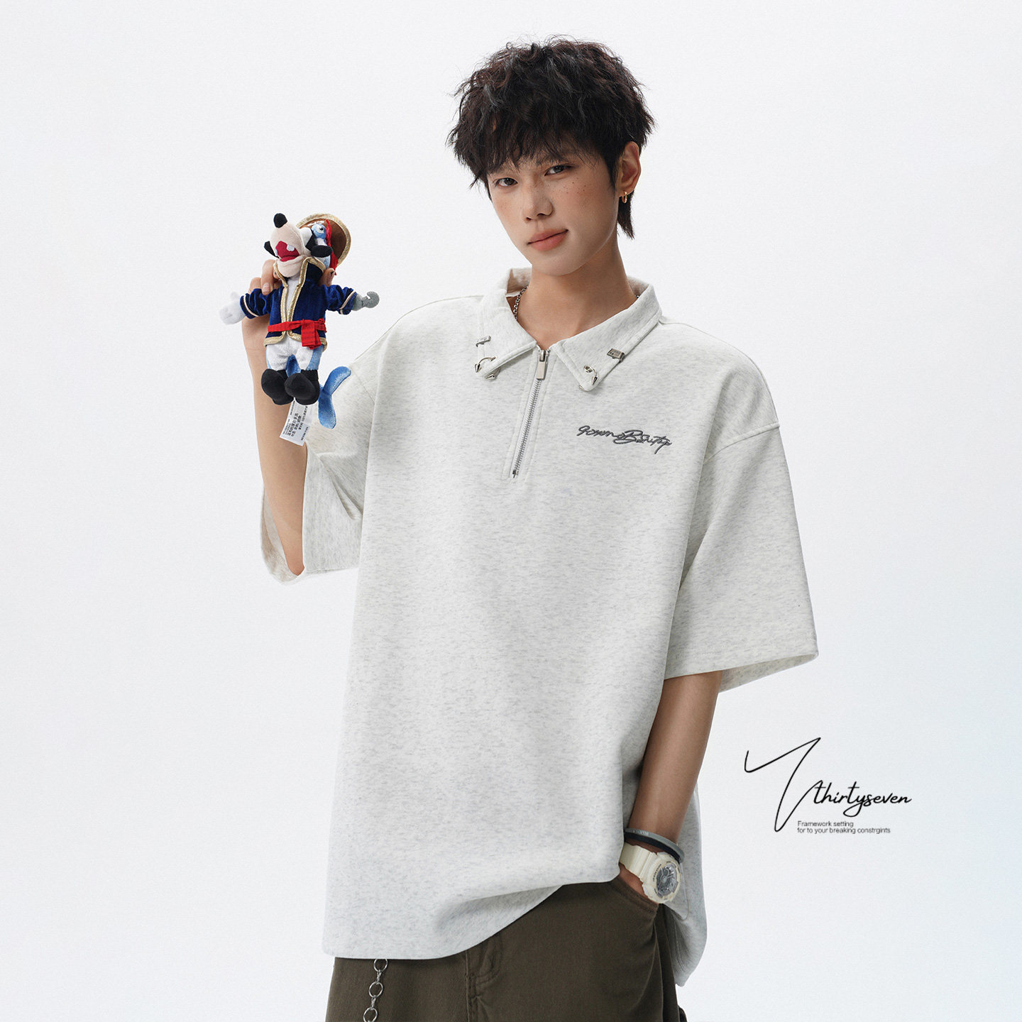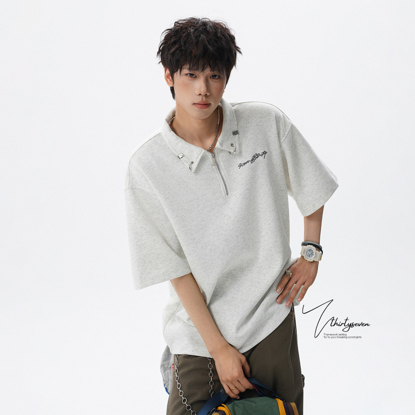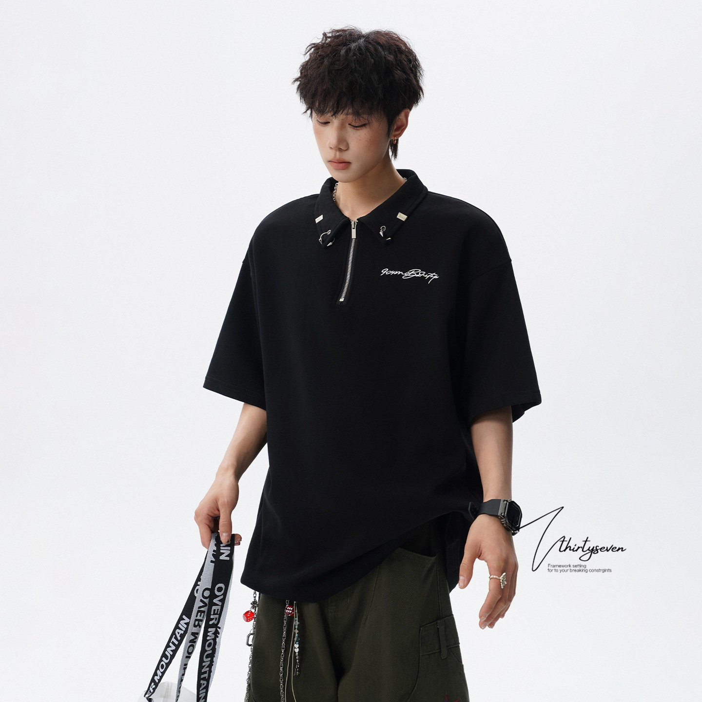 V37潮牌痞帅半拉链polo衫短袖男夏季美式青少年落肩袖宽松翻领t恤