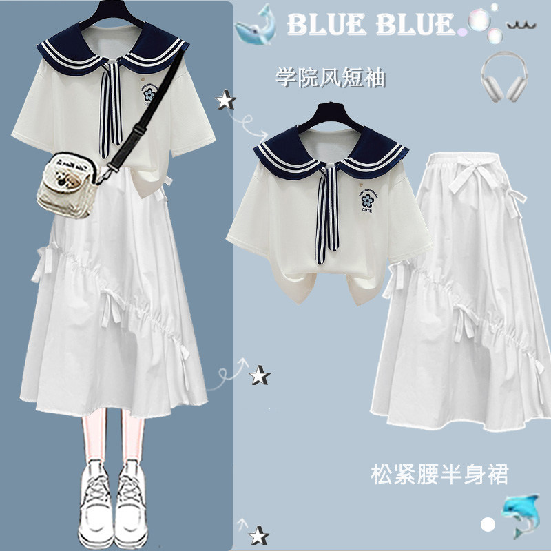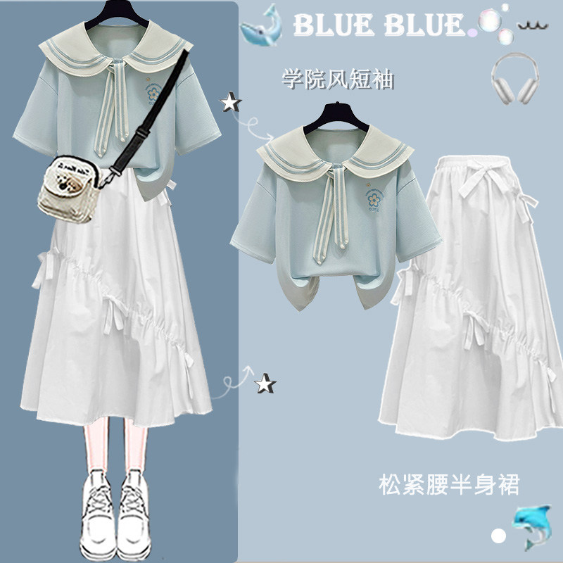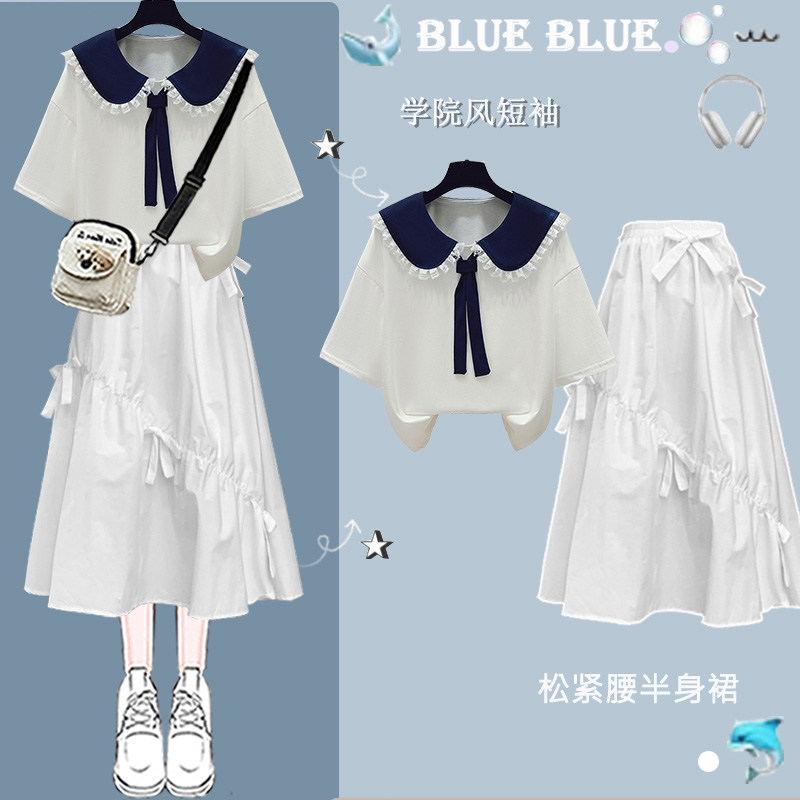 女童超好看纯棉短袖t恤2025新款爆款中大童娃娃领上衣长裙子套装