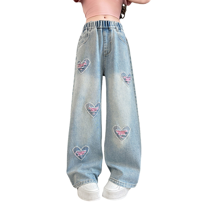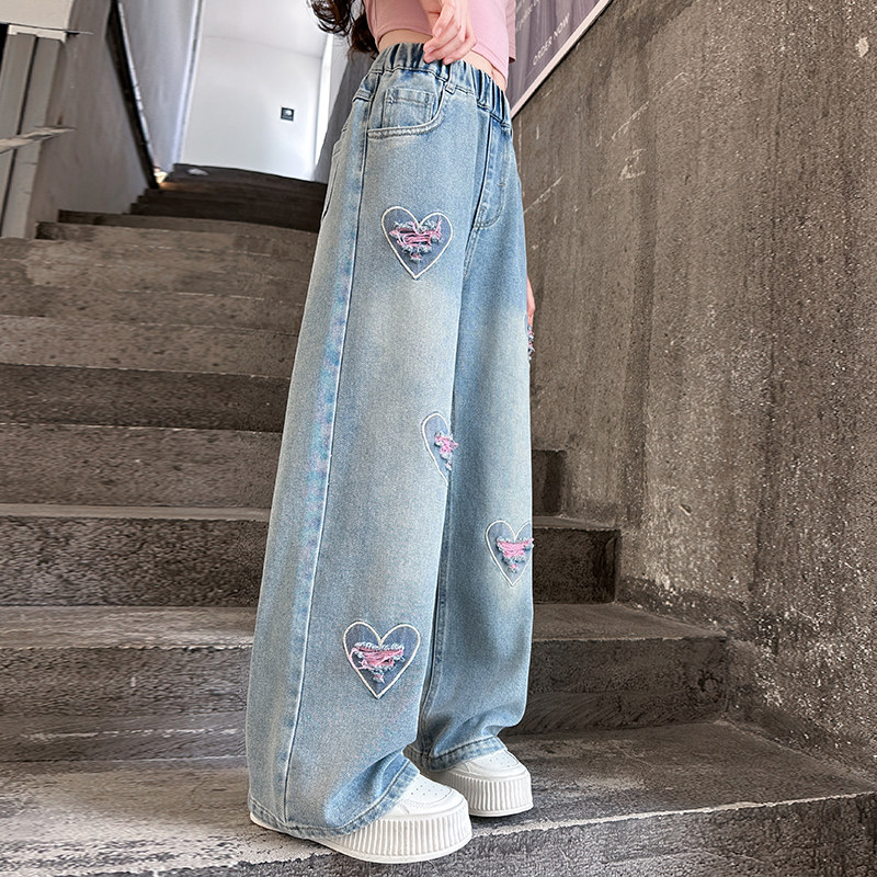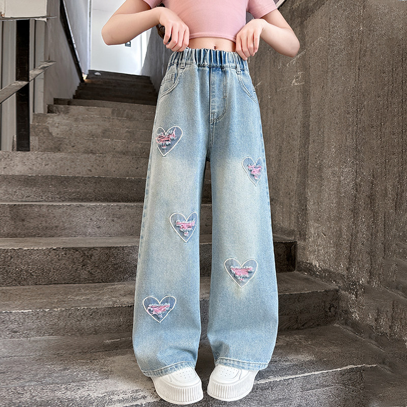 女童牛仔裤春夏薄款2026新款潮女孩网红爱心刺绣直筒阔腿儿童裤子