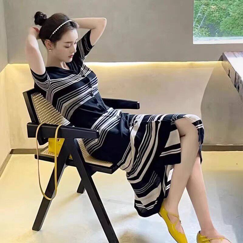 条纹连衣裙子女士装春秋2026新款夏季小个子气质高级感开叉中长裙