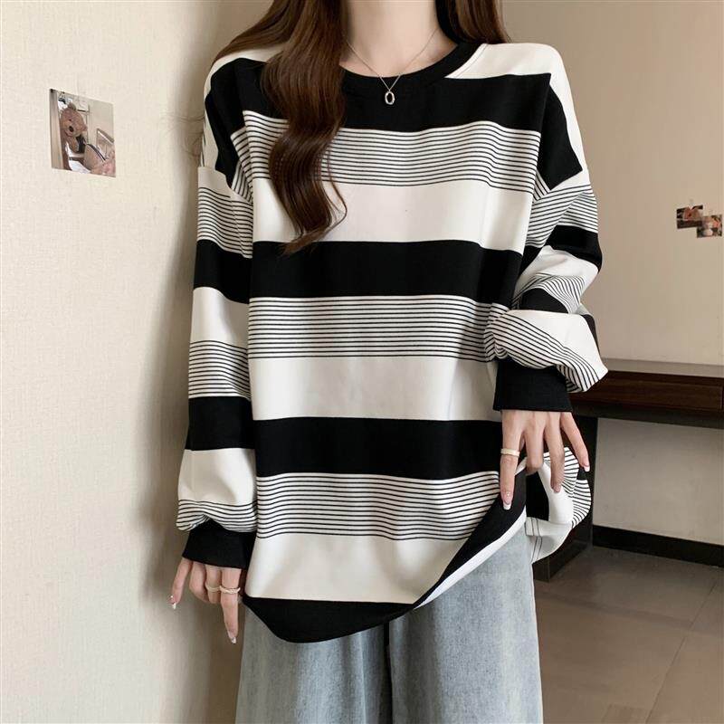2026条纹圆领套头薄款宽松女款时尚撞色休闲风春款卫衣春季女上衣