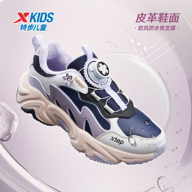 特步童鞋冬季女童中大童加绒内里旋转扣运动休闲舒适儿童防滑棉鞋