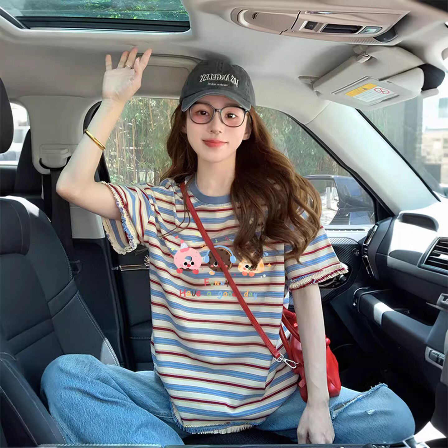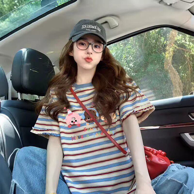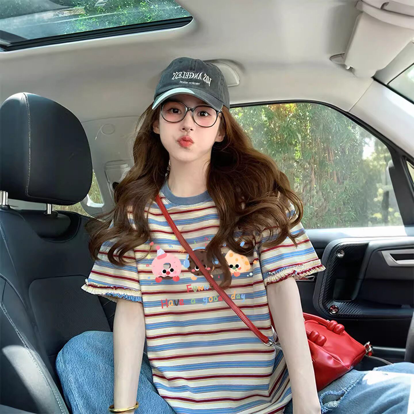 初中高中学生花边条纹短袖t恤女2026新款夏季韩版宽松小个子上衣