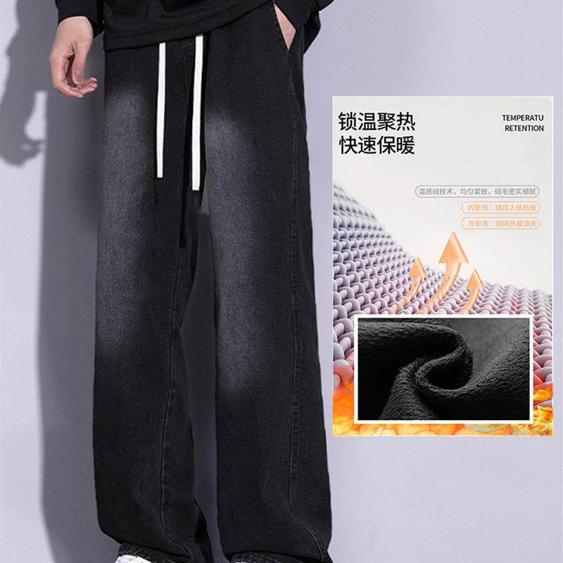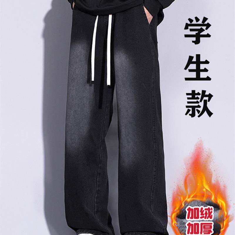 新款加厚直筒裤子12青少年男孩13帅气初高中15大童秋冬加绒牛仔裤