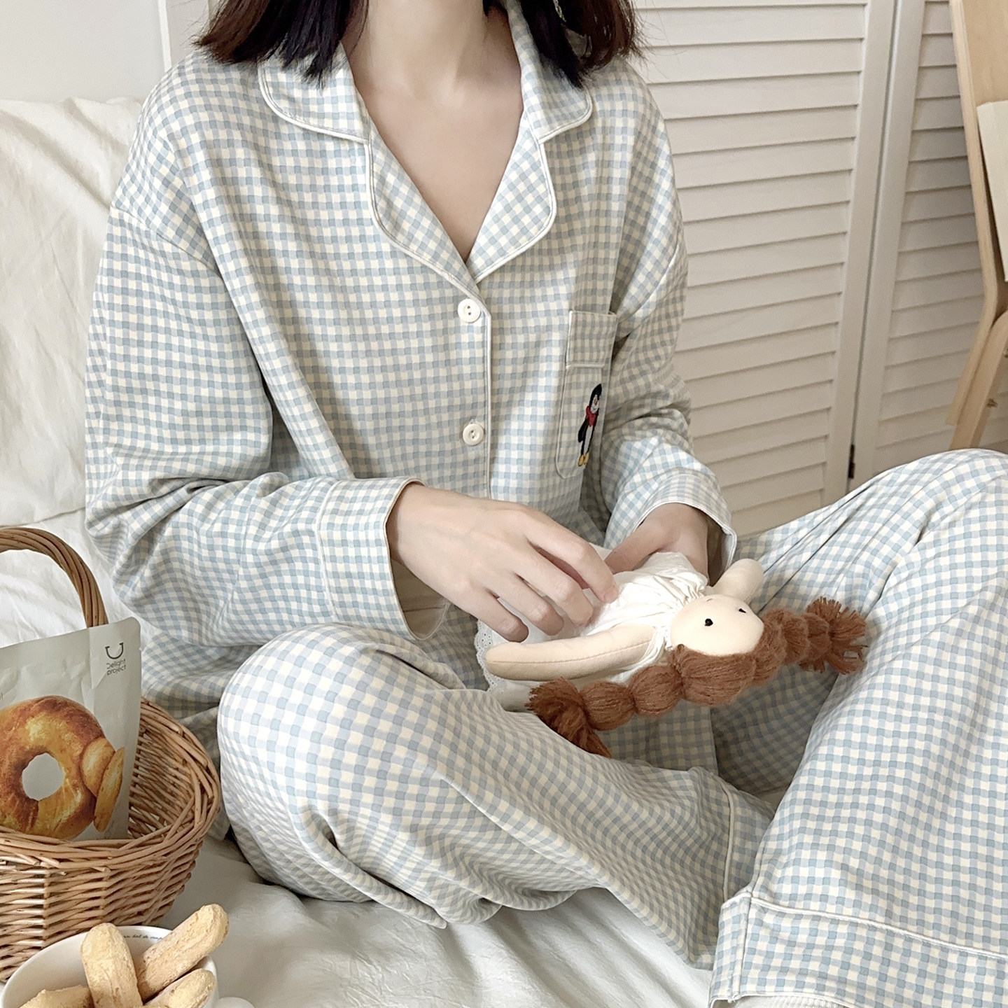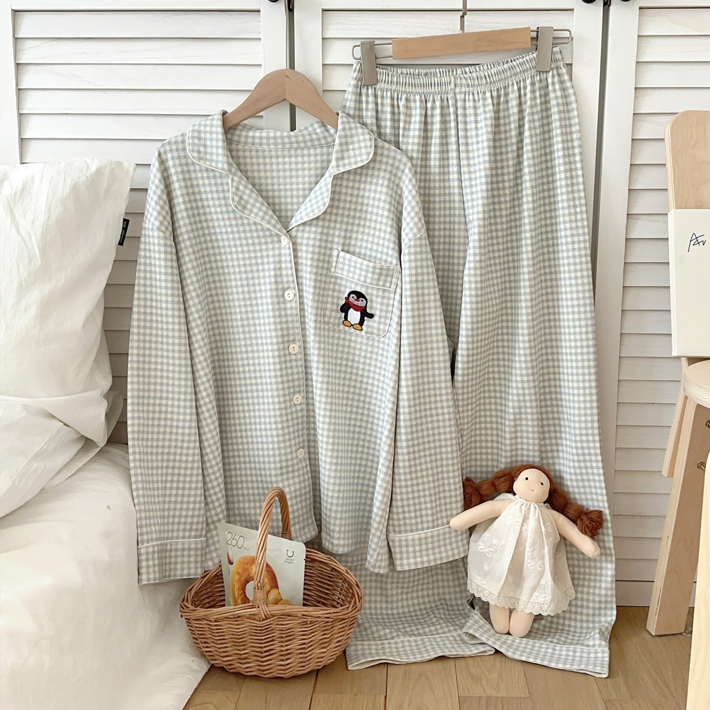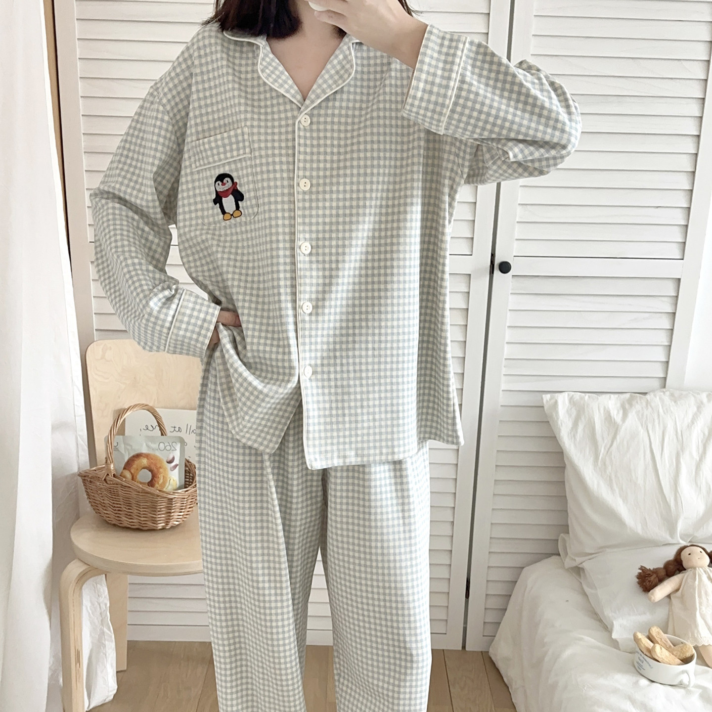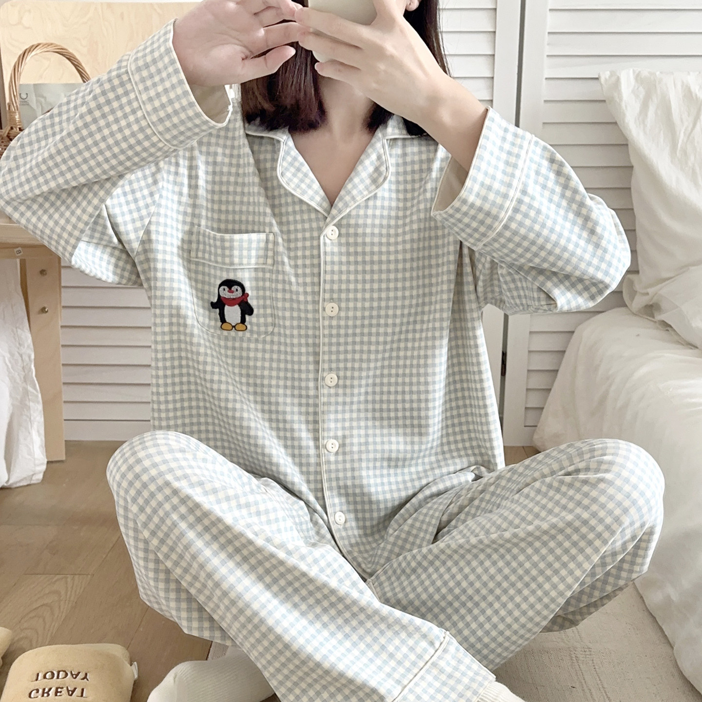 卡通企鹅纯棉睡衣女款春秋长袖可外穿格子家居服套装冬天2025新款