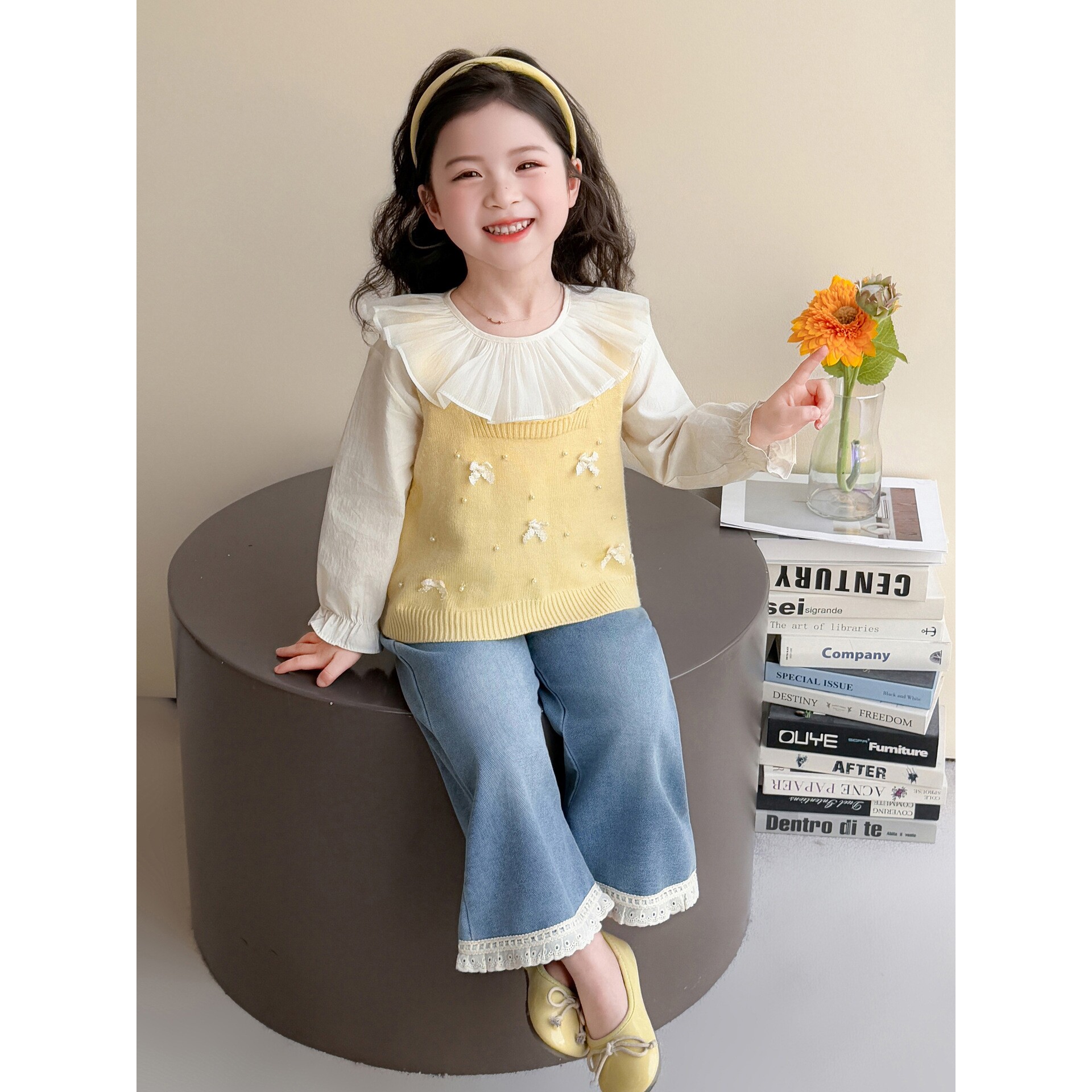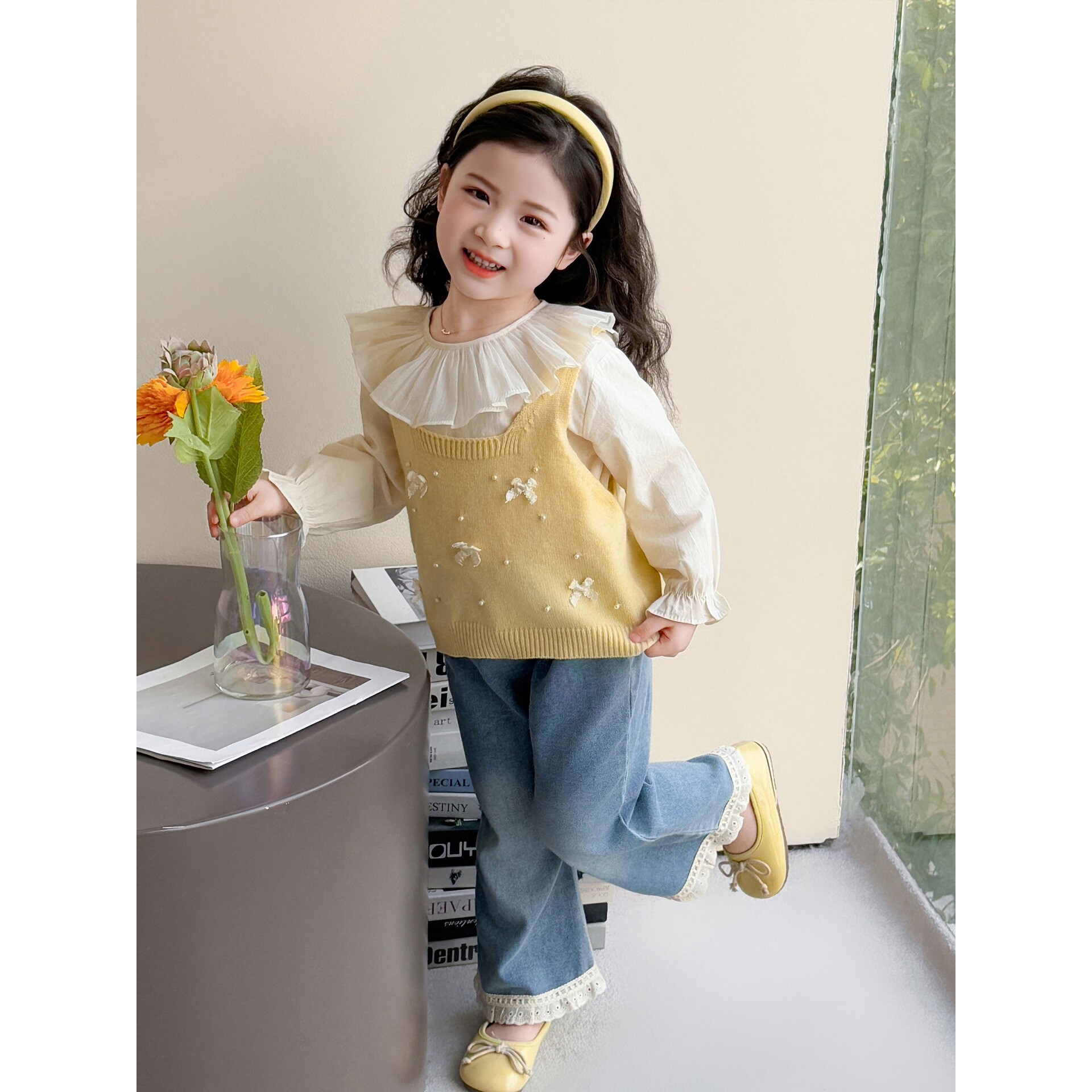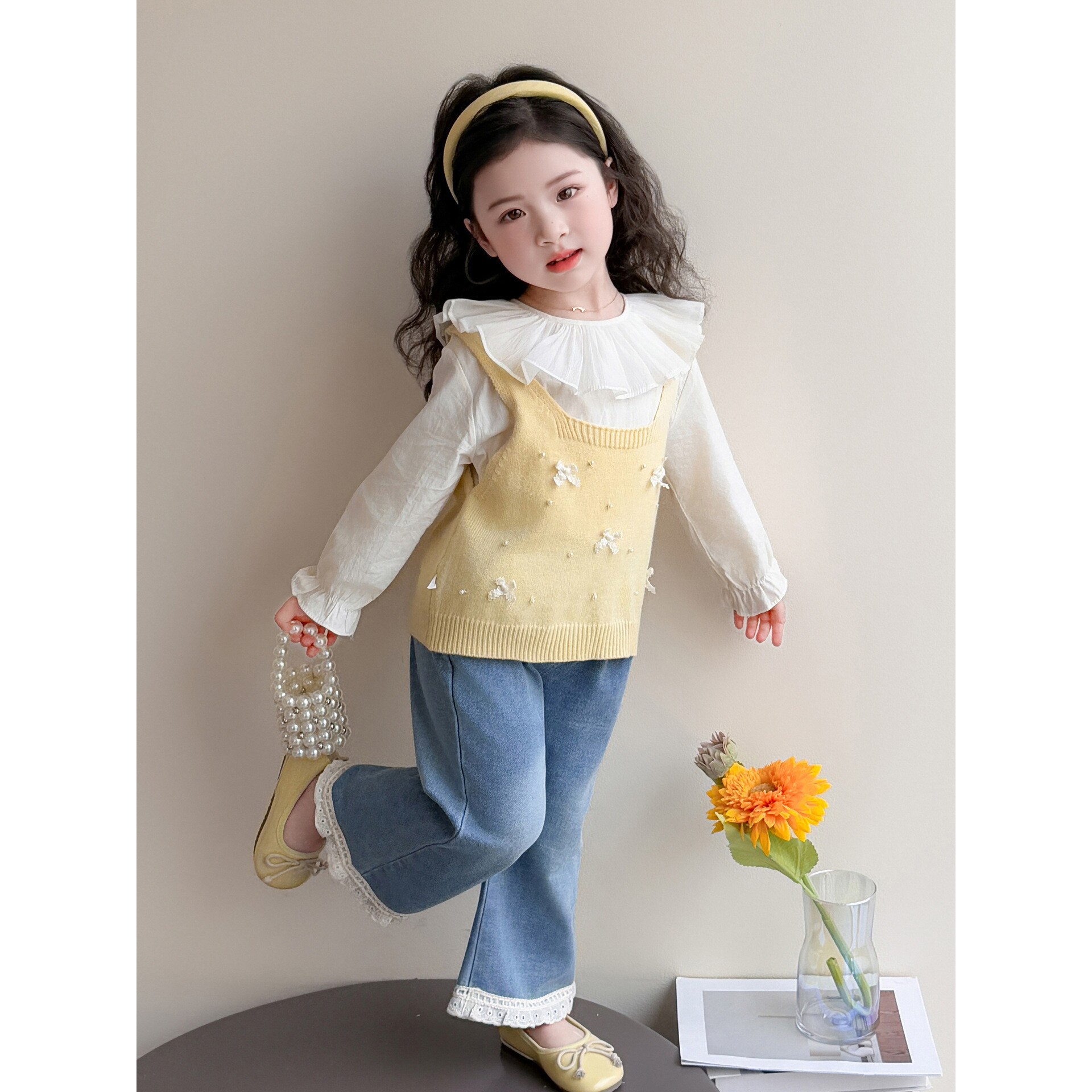女童春装套装2026新款洋气儿童蝴蝶结马甲针织衫春秋款女宝三件套