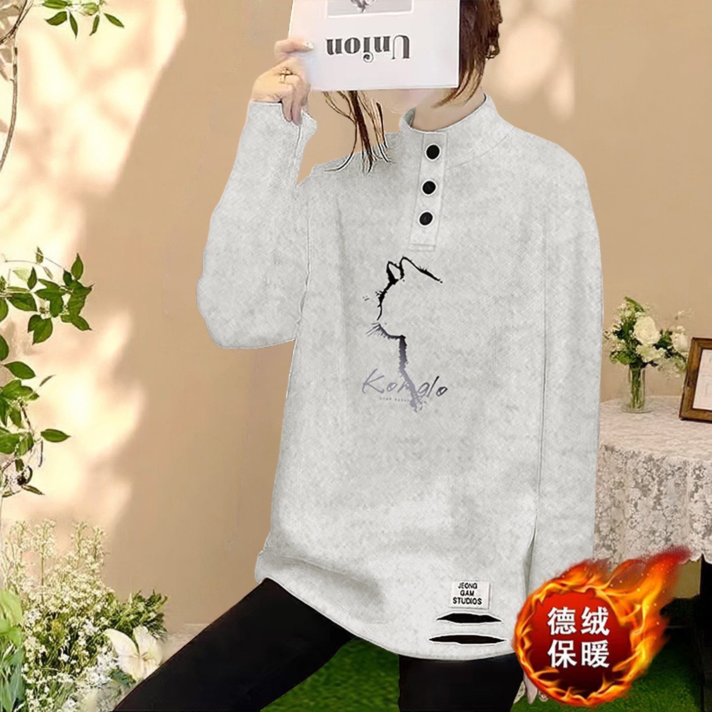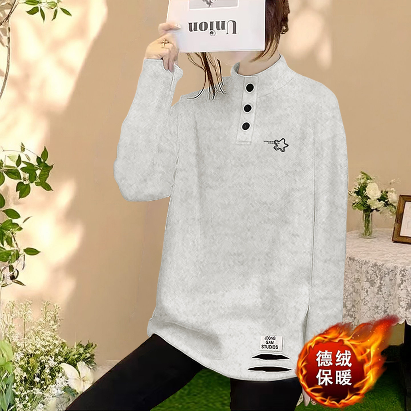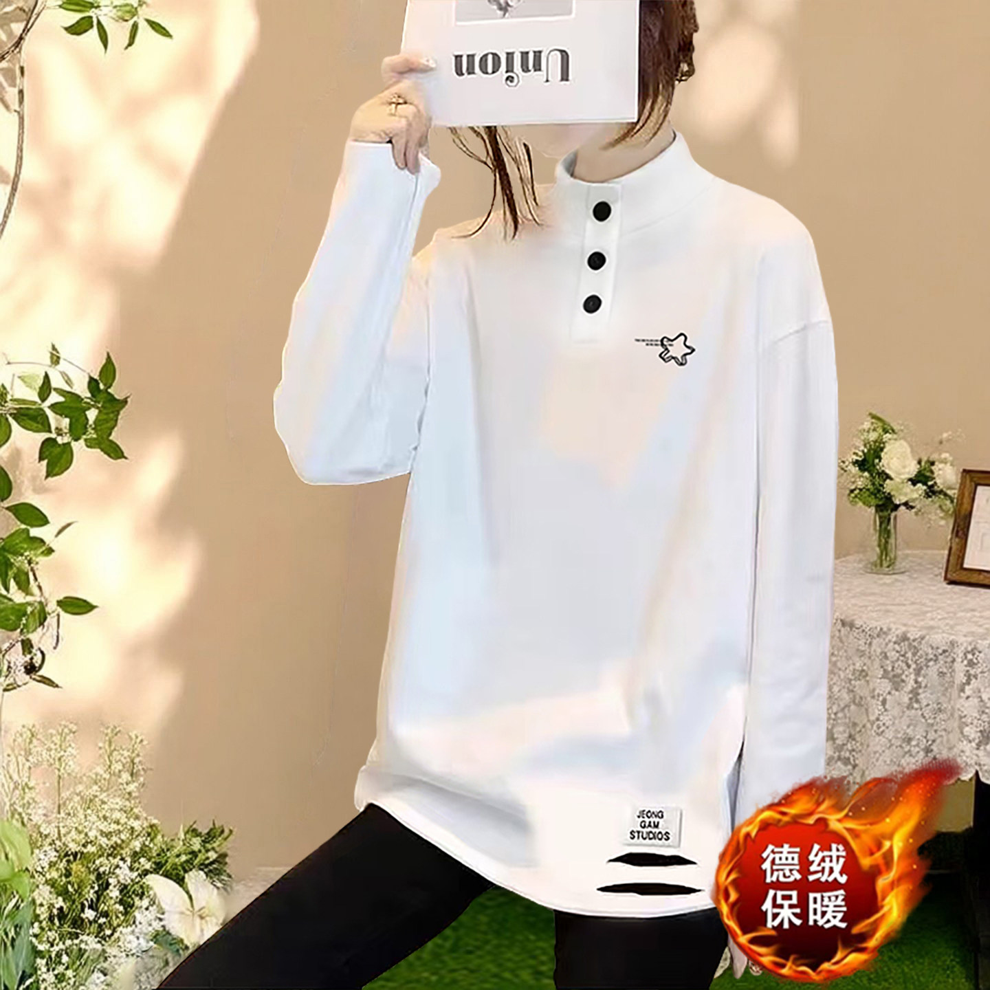 韩版德绒加厚长袖T恤女款半高领纽扣2026春装中长款破洞遮臀上衣