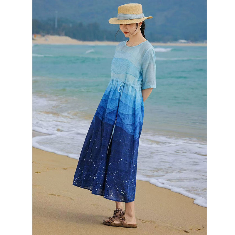 渐变苎麻五分袖连衣裙女士大码夏季文艺复古印花度假裙~清仓尾货