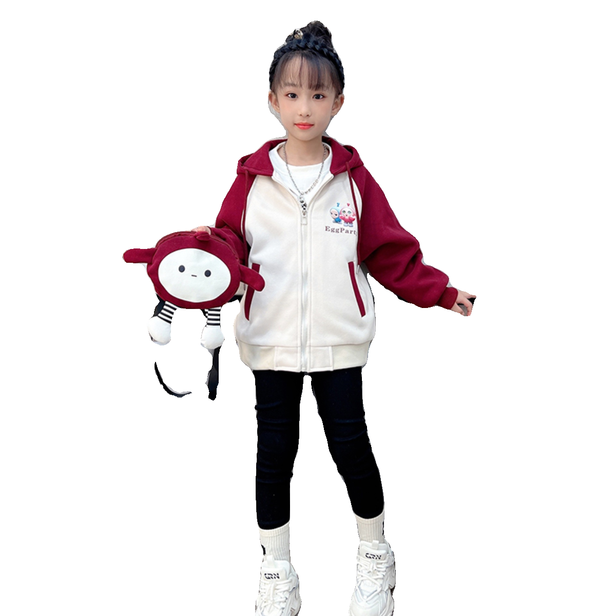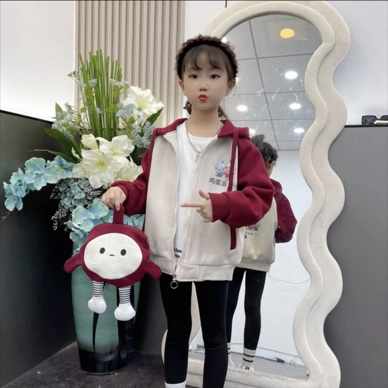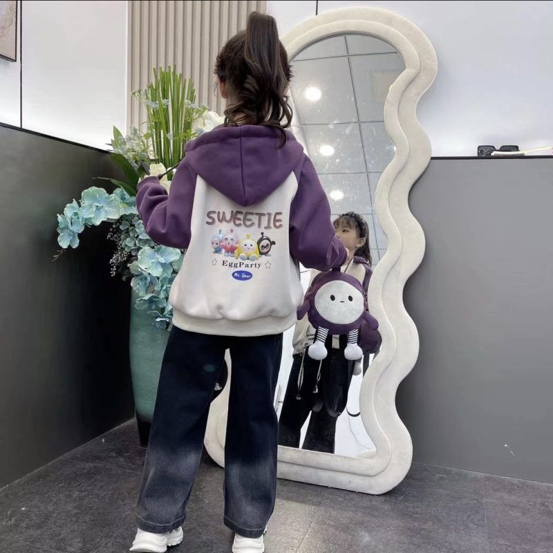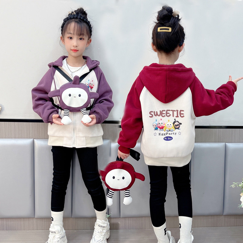 女童卡通印花拼色加厚连帽卫衣外套2023秋冬新款韩版网红女孩上衣