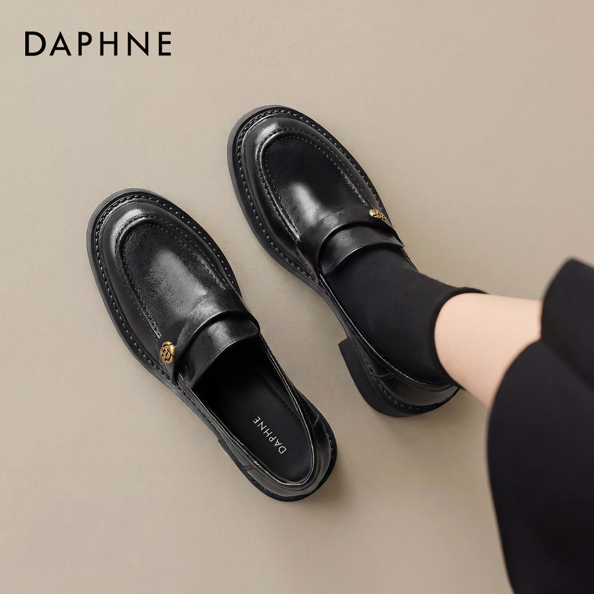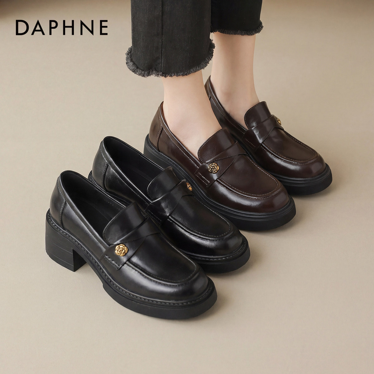 达芙妮粗跟乐福鞋女款2026新款春季英伦风黑色小皮鞋单鞋子高跟鞋
