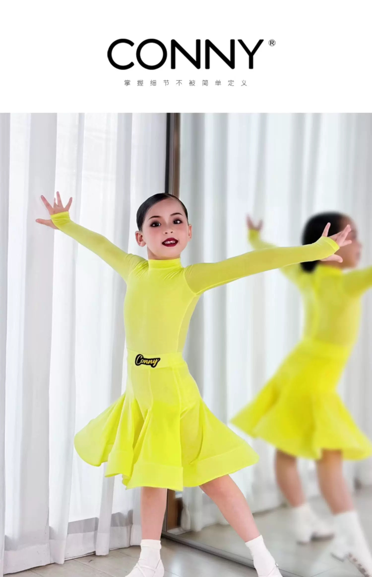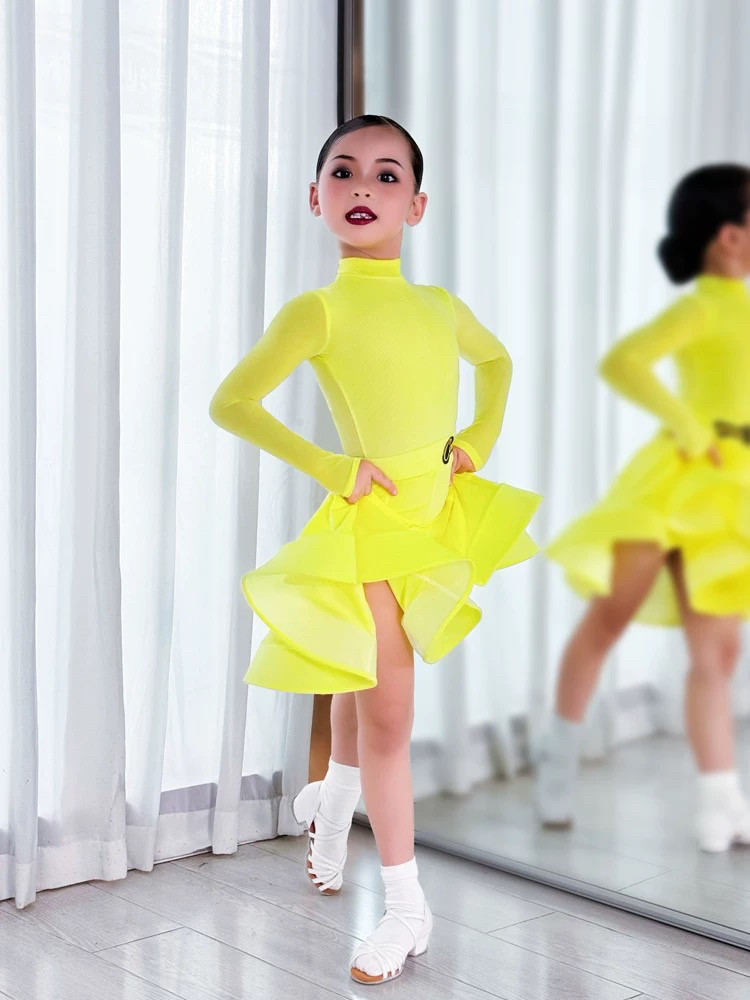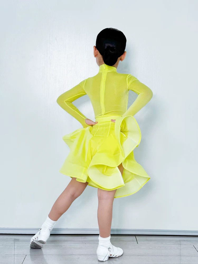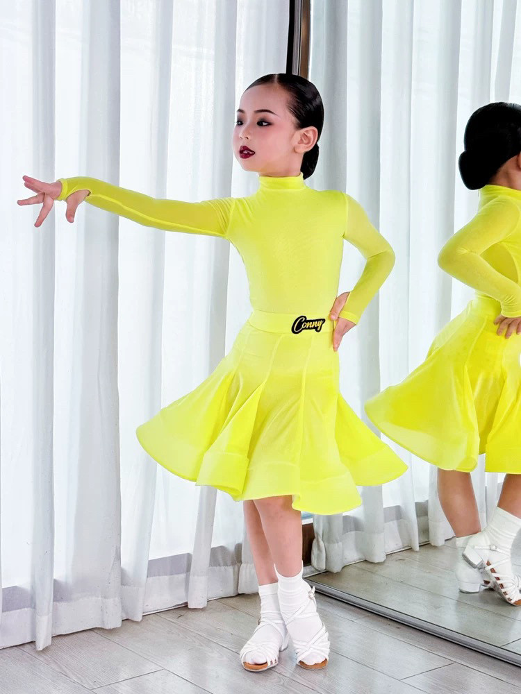 CONNY少儿拉丁舞鹅黄色比赛规定服装小高领薄绒款长袖鱼骨裙子