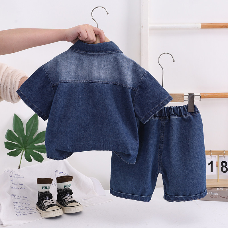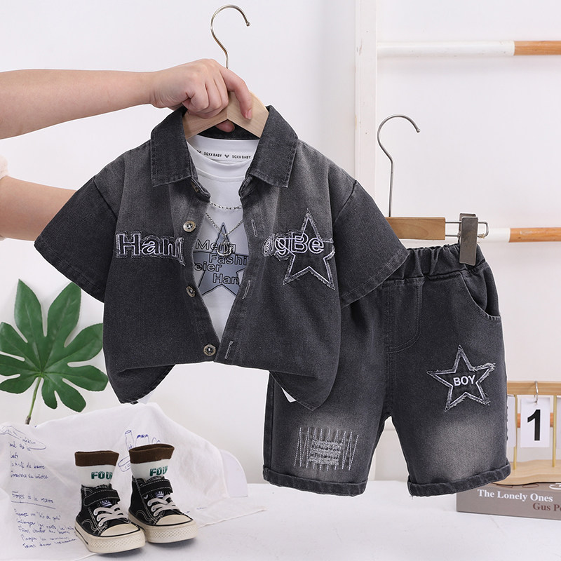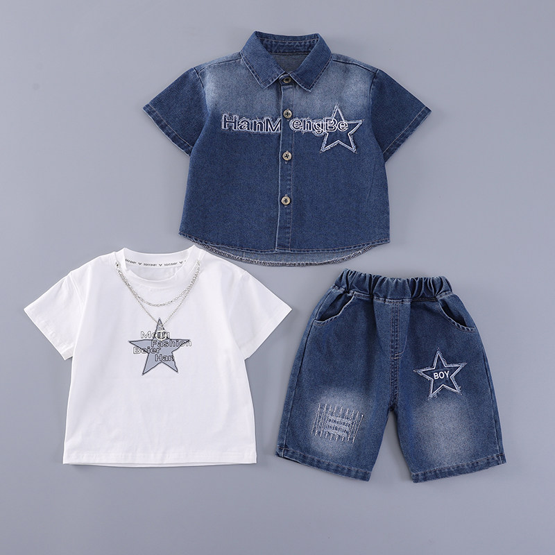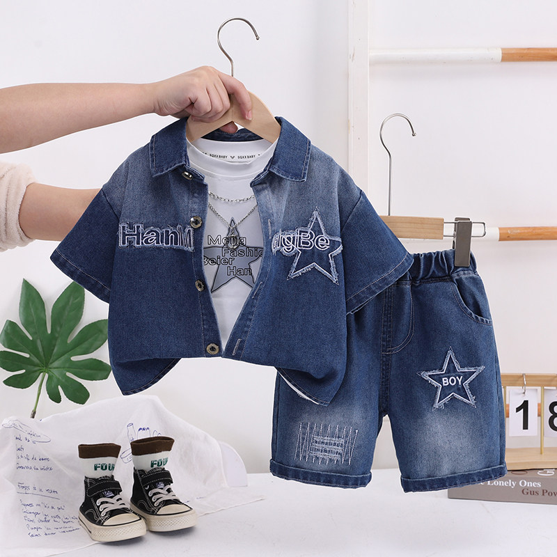 儿童夏装男童套装2026新款宝宝夏天牛仔衬衫短袖三件套男孩衣服潮