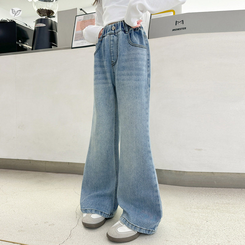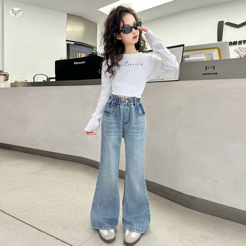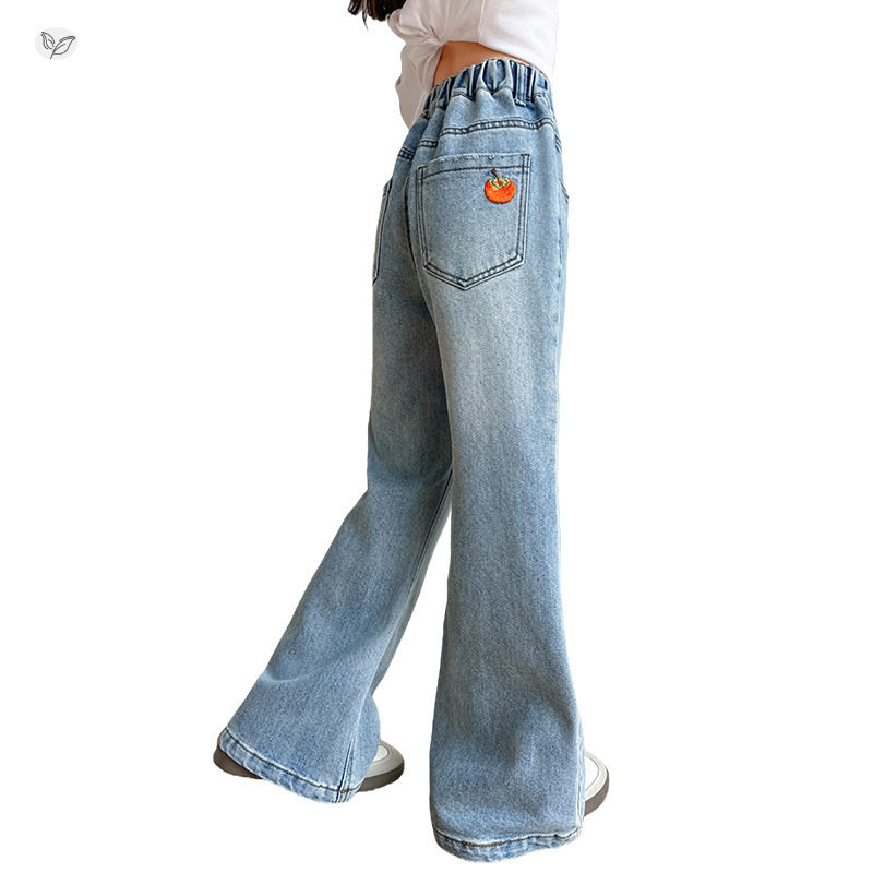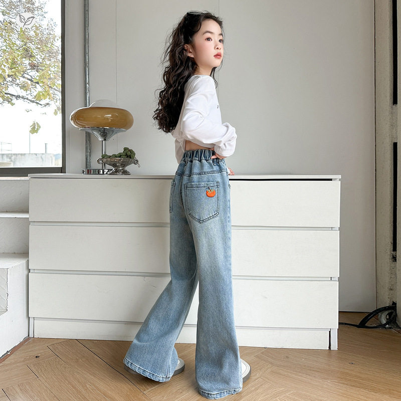 女童春秋后袋刺绣微喇裤2026新款中大童修身牛仔裤浅蓝色长裤