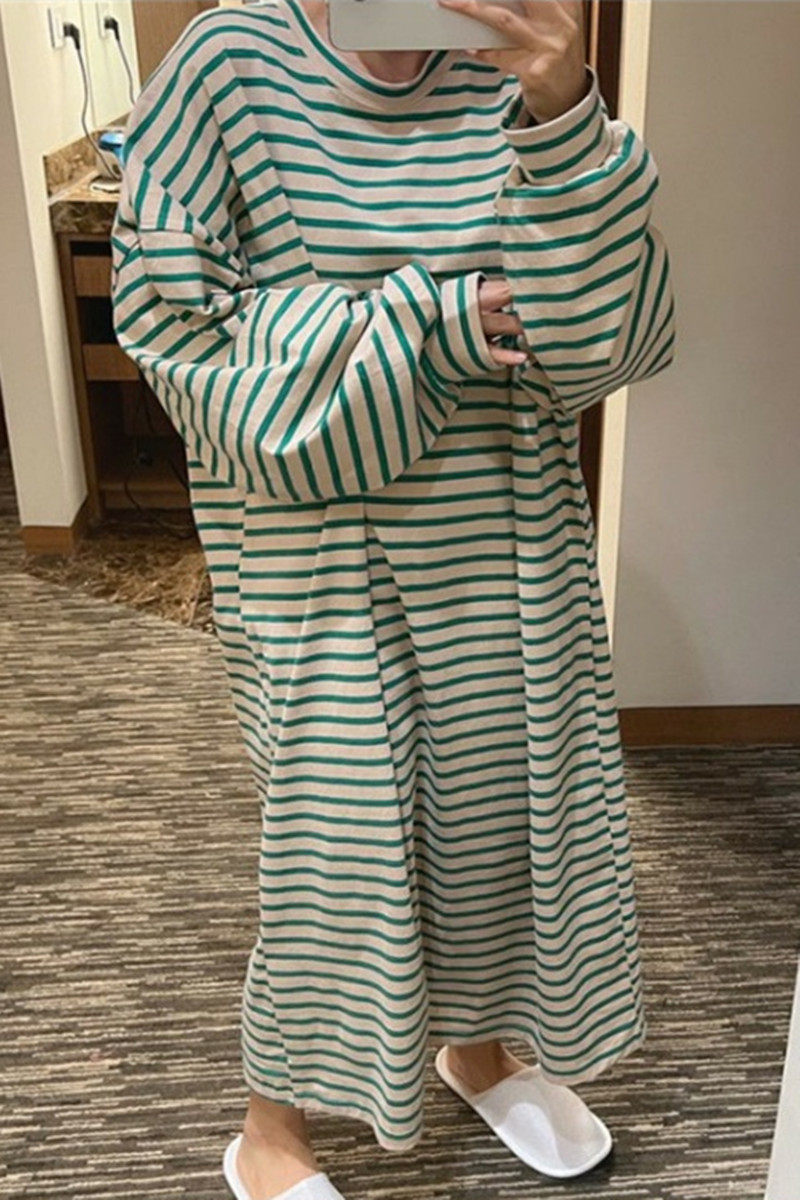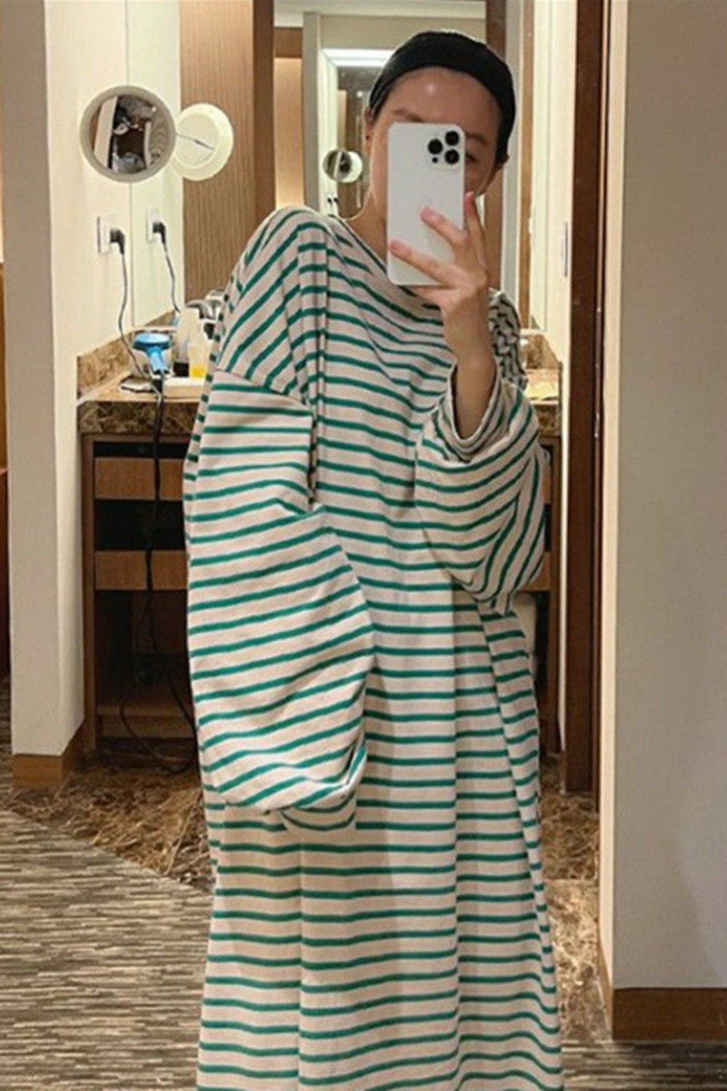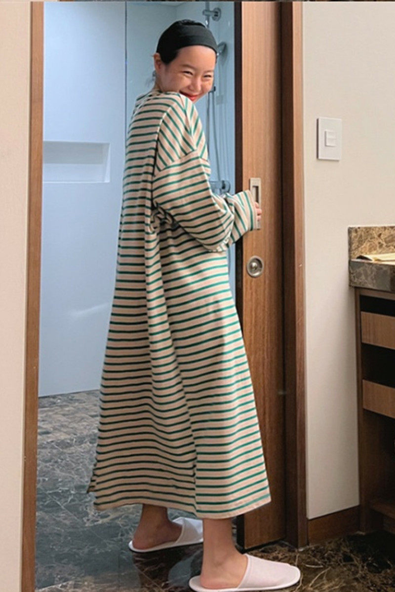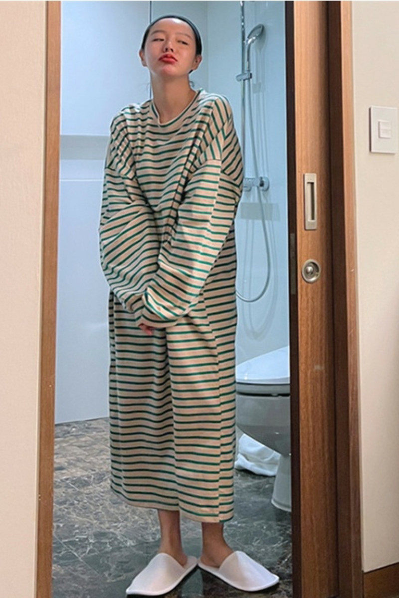 新款长袖 套头纯棉条纹T恤连衣裙女中长款韩版宽松大码休闲T恤裙