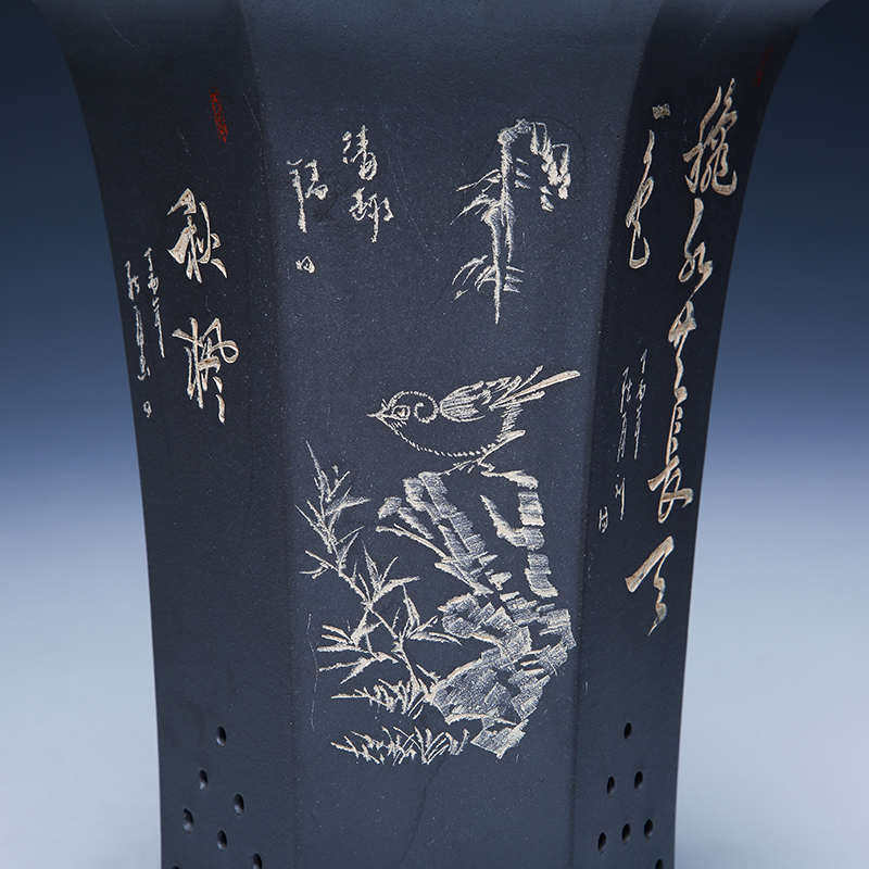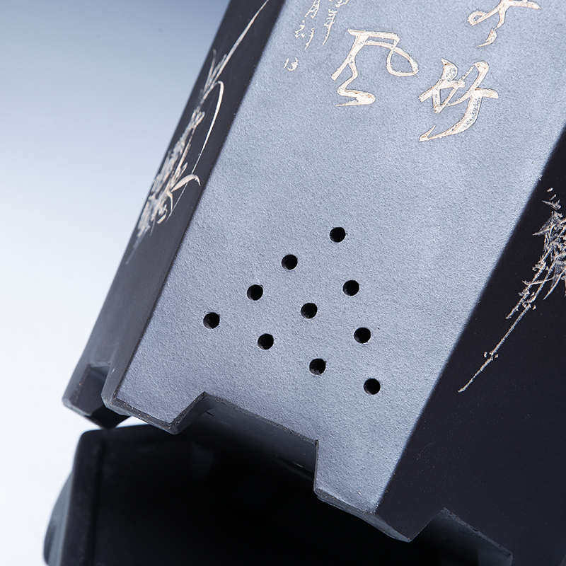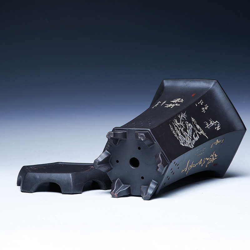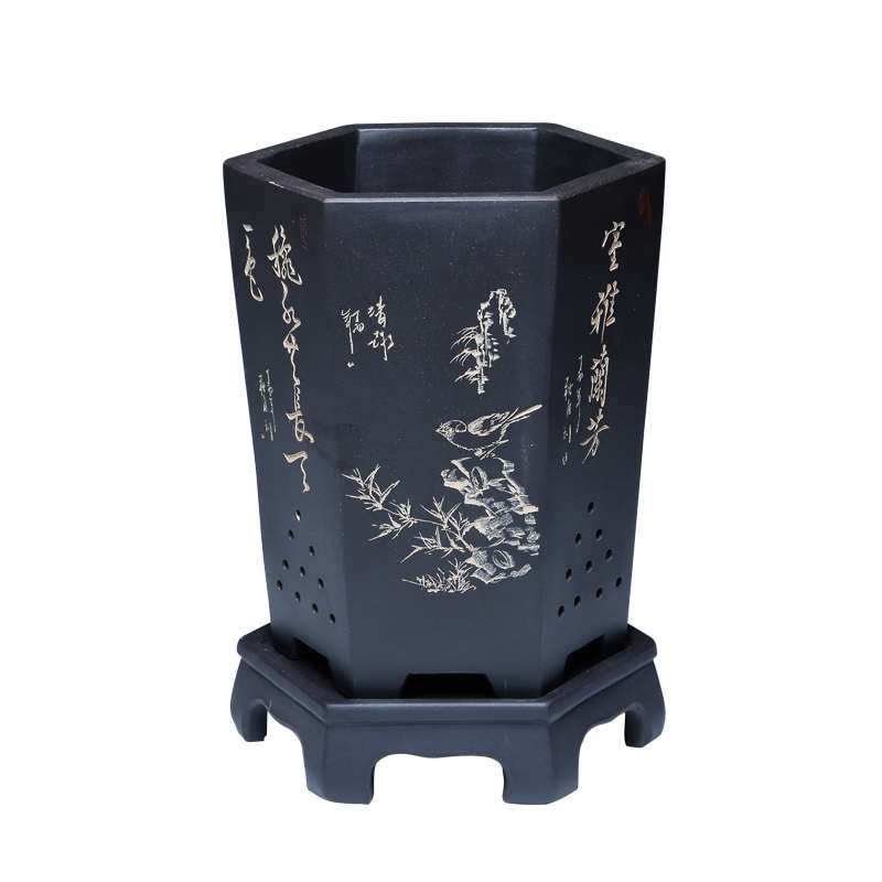 宜兴精品紫砂兰花盆六角黑色高档手工兰花花盆带托盘透气专用盆