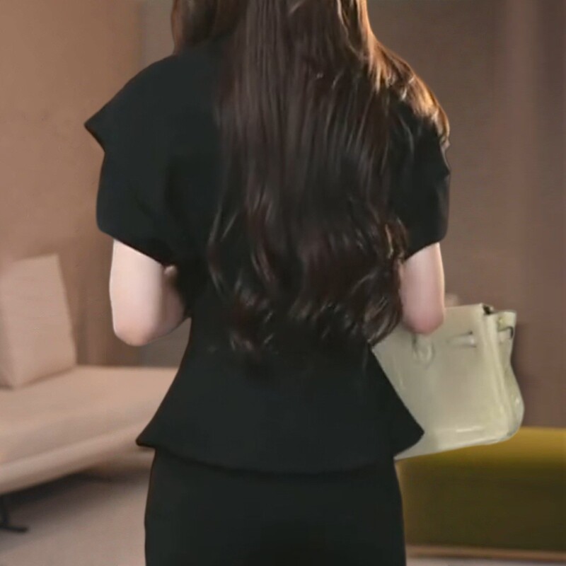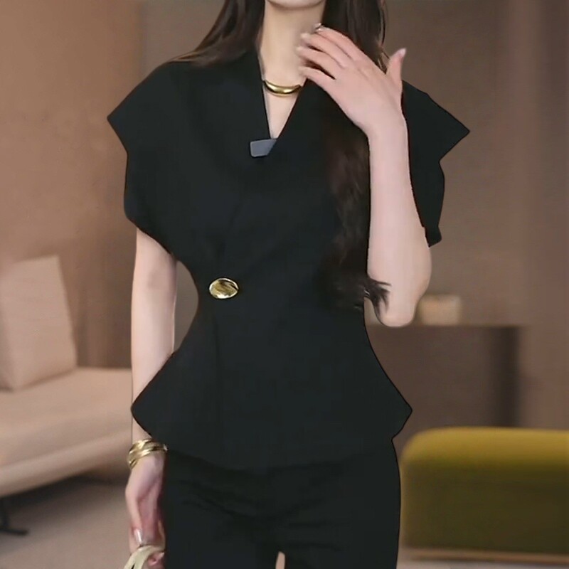 高级感气质显瘦V领黑色衬衫女款遮肚子宽松显瘦大码短袖上衣衬衣