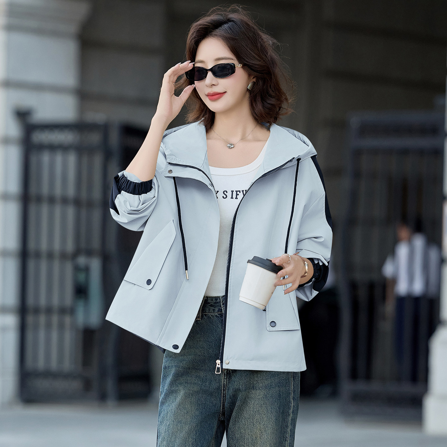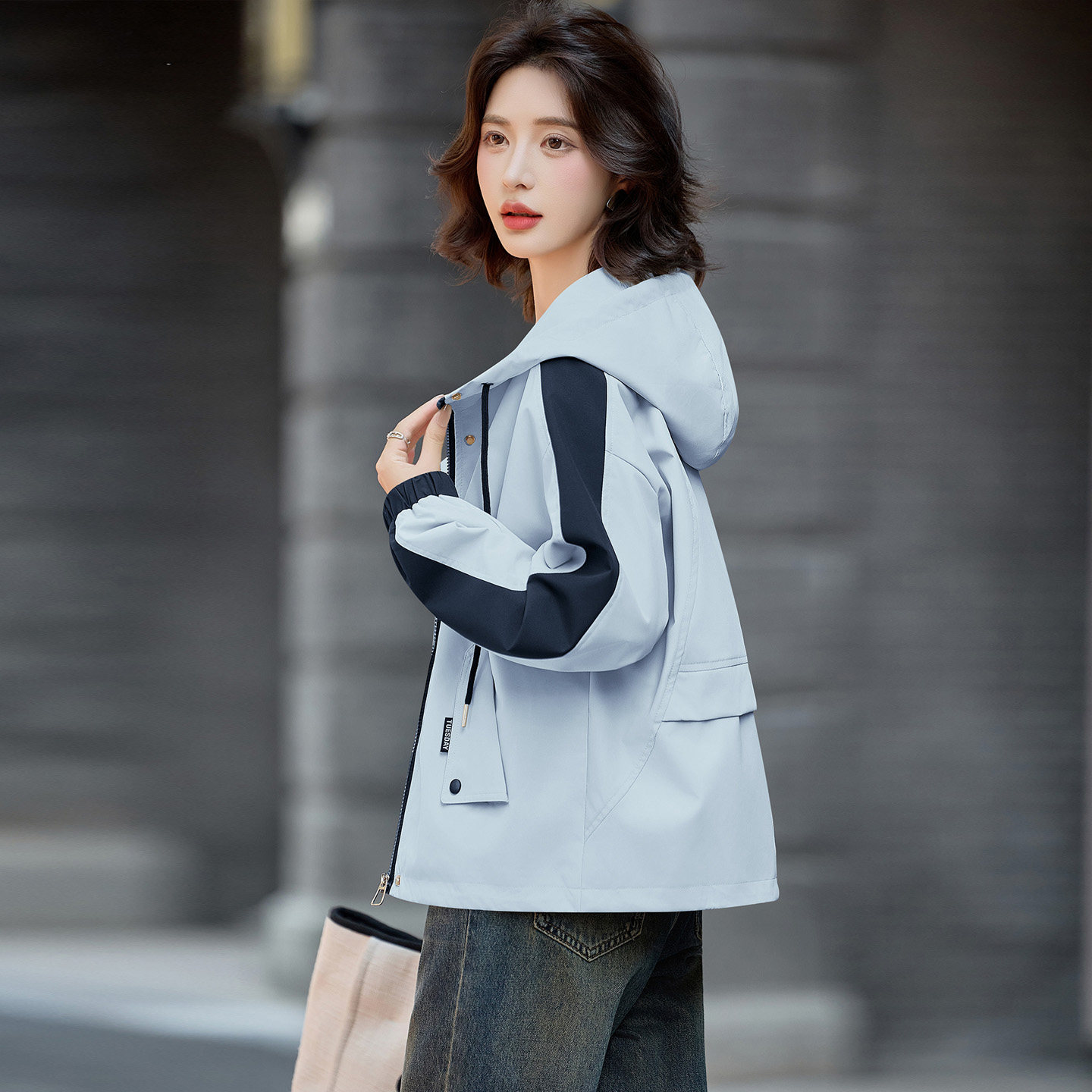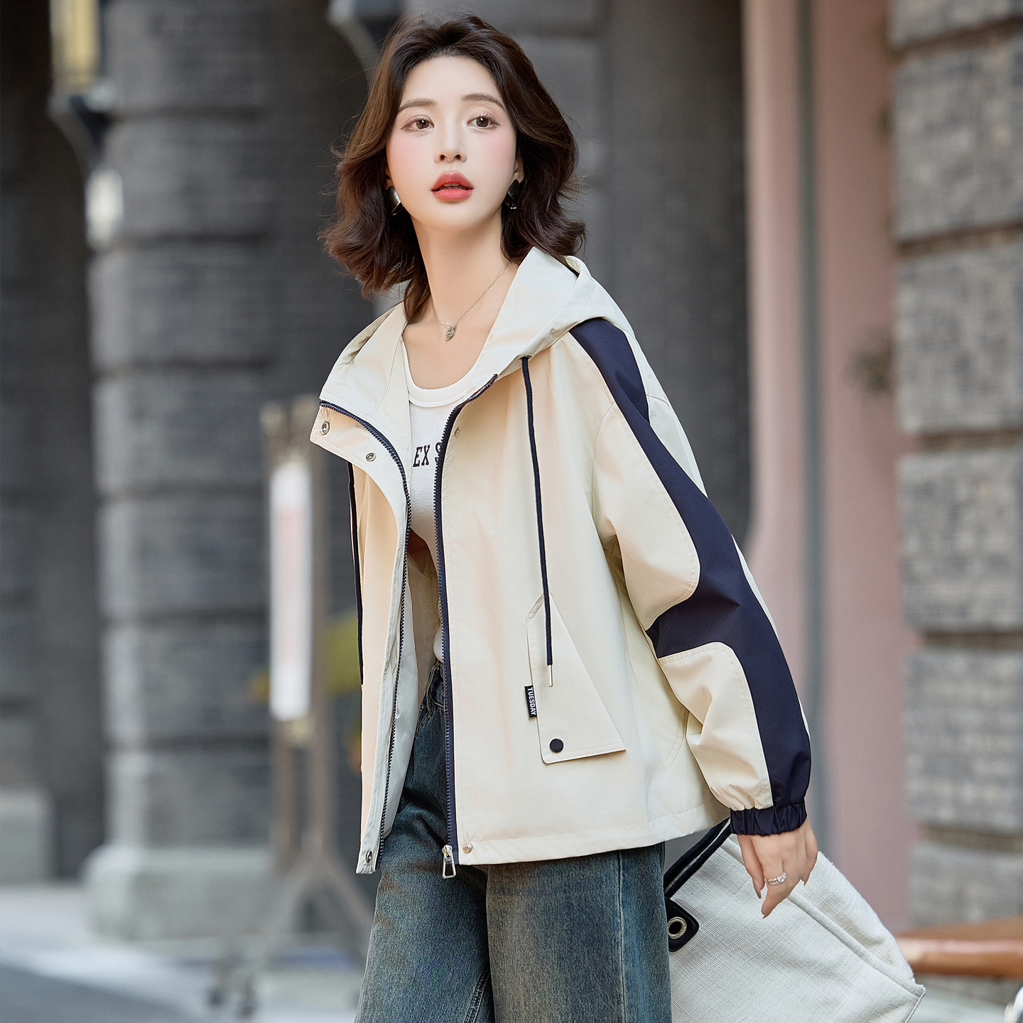 巨好看拼色连帽风衣女款2026春秋新款宽松休闲小个子短款外套夹克
